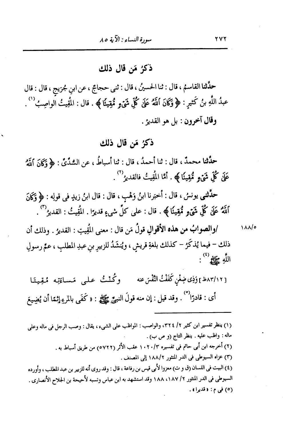 ذِكْرُ مَنْ قَالَ ذَلِكَ: حَدَّثَنَا مُحَمَّدُ بْنُ الْحُسَيْنِ , قَالَ: ثنا أَحْمَدُ بْنُ مُفَضَّلٍ , قَالَ: ثنا أَسْبَاطٌ , عَنِ السُّدِّيِّ: {§وَكَانَ اللَّهُ عَلَى كُلِّ شَيْءٍ مُقِيتًا} [النساء: 85] أَمَّا الْمُقِيتُ: فَالْقَدِيرُ "