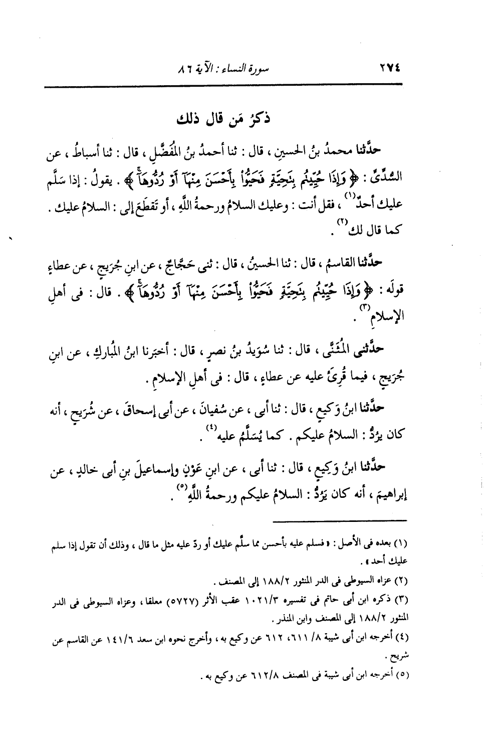 ذِكْرُ مَنْ قَالَ ذَلِكَ: حَدَّثَنِي مُحَمَّدُ بْنُ الْحُسَيْنِ , قَالَ: ثنا أَحْمَدُ بْنُ مُفَضَّلٍ , قَالَ: ثنا أَسْبَاطٌ , عَنِ السُّدِّيِّ: {§وَإِذَا حُيِّيتُمْ بِتَحِيَّةٍ فَحَيُّوا بِأَحْسَنَ مِنْهَا أَوْ رُدُّوهَا} [النساء: 86] يَقُولُ: " إِذَا سَلَّمَ عَلَيْكَ أَحَدٌ , فَقُلْ أَنْتَ: وَعَلَيْكَ السَّلَامُ وَرَحْمَةُ اللَّهِ , أَوْ تَقْطَعُ إِلَى السَّلَامُ عَلَيْكَ , كَمَا قَالَ لَكَ "