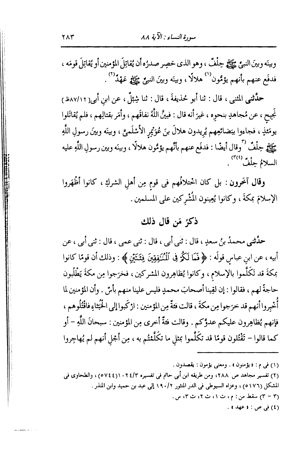ذِكْرُ مَنْ قَالَ ذَلِكَ: حَدَّثَنِي مُحَمَّدُ بْنُ سَعْدٍ , قَالَ: ثني أَبِي قَالَ: ثني عَمِّي قَالَ: ثني أَبِي عَنْ أَبِيهِ , عَنِ ابْنِ عَبَّاسٍ , قَوْلُهُ: {§فَمَا لَكُمْ فِي الْمُنَافِقِينَ فِئَتَيْنِ} [النساء: 88] وَذَلِكَ أَنَّ قَوْمًا كَانُوا بِمَكَّةَ قَدْ تَكَلَّمُوا بِالْإِسْلَامِ , وَكَانُوا يُظَاهِرُونَ الْمُشْرِكِينَ , فَخَرَجُوا مِنْ مَكَّةَ يَطْلُبُونَ حَاجَةً لَهُمْ , فَقَالُوا: إِنْ لَقِينَا أَصْحَابَ مُحَمَّدٍ عَلَيْهِ الصَّلَاةُ وَالسَّلَامُ , فَلَيْسَ عَلَيْنَا مِنْهُمْ بَأْسٌ. وَأَنَّ الْمُؤْمِنِينَ لَمَّا أُخْبِرُوا أَنَّهُمْ قَدْ خَرَجُوا مِنْ مَكَّةَ قَالَتْ فِئَةٌ مِنَ الْمُؤْمِنِينَ: ارْكَبُوا إِلَى الْخُبَثَاءِ فَاقْتُلُوهُمْ , فَإِنَّهُمْ يُظَاهِرُونَ عَلَيْكُمْ عَدُوَّكُمْ. وَقَالَتْ فِئَةٌ أُخْرَى مِنَ الْمُؤْمِنِينَ: سُبْحَانَ اللَّهِ , أَوْ كَمَا قَالُوا , أَتَقْتُلُونَ قَوْمًا قَدْ تَكَلَّمُوا بِمِثْلِ مَا تَكَلَّمْتُمْ بِهِ؟ مِنْ أَجْلِ أَنَّهُمْ لَمْ يُهَاجِرُوا -[284]- وَيَتْرُكُوا دِيَارَهُمْ تُسْتَحَلُّ دِمَاؤُهُمْ وَأَمْوَالُهُمْ لِذَلِكَ. فَكَانُوا كَذَلِكَ فِئَتَيْنِ , وَالرَّسُولُ عَلَيْهِ الصَّلَاةُ وَالسَّلَامُ عِنْدَهُمْ لَا يَنْهَى وَاحِدًا مِنَ الْفَرِيقَيْنِ عَنْ شَيْءٍ؛ فَنَزَلَتْ: {فَمَا لَكُمْ فِي الْمُنَافِقِينَ فِئَتَيْنِ وَاللَّهُ أَرْكَسَهُمْ بِمَا كَسَبُوا أَتُرِيدُونَ أَنْ تَهْدُوا مَنْ أَضَلَّ اللَّهُ} [النساء: 88] الْآيَةُ "