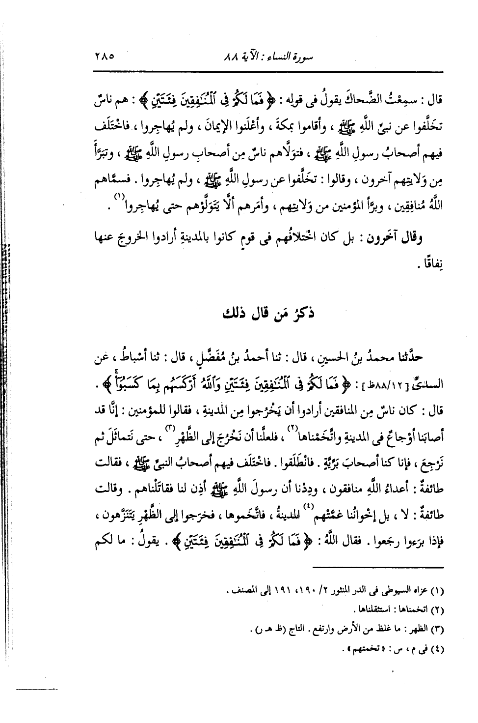 ذِكْرُ مَنْ قَالَ ذَلِكَ: حَدَّثَنَا مُحَمَّدُ بْنُ الْحُسَيْنِ , قَالَ: ثنا أَحْمَدُ بْنُ مُفَضَّلٍ , قَالَ: ثنا أَسْبَاطٌ , عَنِ السُّدِّيِّ: {§فَمَا لَكُمْ فِي الْمُنَافِقِينَ فِئَتَيْنِ وَاللَّهُ أَرْكَسَهُمْ بِمَا كَسَبُوا} [النساء: 88] قَالَ: " كَانَ نَاسٌ مِنَ الْمُنَافِقِينَ أَرَادُوا أَنْ يَخْرُجُوا مِنَ الْمَدِينَةِ , فَقَالُوا لِلْمُؤْمِنِينَ: إِنَّا قَدْ أَصَابَنَا أَوْجَاعٌ فِي الْمَدِينَةِ وَاتَّخَمْنَاهَا , فَلَعَلَّنَا أَنْ نَخْرُجَ إِلَى الظَّهْرِ حَتَّى نَتَمَاثَلَ ثُمَّ نَرْجِعَ , فَإِنَّا كُنَّا أَصْحَابَ بَرِيَّةٍ. فَانْطَلَقُوا؛ وَاخْتَلَفَ فِيهِمْ أَصْحَابُ النَّبِيِّ صَلَّى اللهُ عَلَيْهِ وَسَلَّمَ , فَقَالَتْ طَائِفَةٌ: أَعْدَاءُ اللَّهِ الْمُنَافِقُونَ , وَدِدْنَا أَنَّ رَسُولَ اللَّهِ صَلَّى اللهُ عَلَيْهِ وَسَلَّمَ أَذِنَ لَنَا فَقَاتَلْنَاهُمْ. وَقَالَتْ طَائِفَةٌ: لَا , بَلْ إِخْوَانُنَا تَخِمَتْهُمُ الْمَدِينَةُ فَاتَّخَمُوهَا. فَخَرَجُوا إِلَى الظَّهْرِ يَتَنَزَّهُونَ , فَإِذَا بَرَءُوا رَجَعُوا. فَقَالَ اللَّهُ: {فَمَا لَكُمْ فِي الْمُنَافِقِينَ فِئَتَيْنِ} [النساء: 88] يَقُولُ: " مَا لَكُمْ