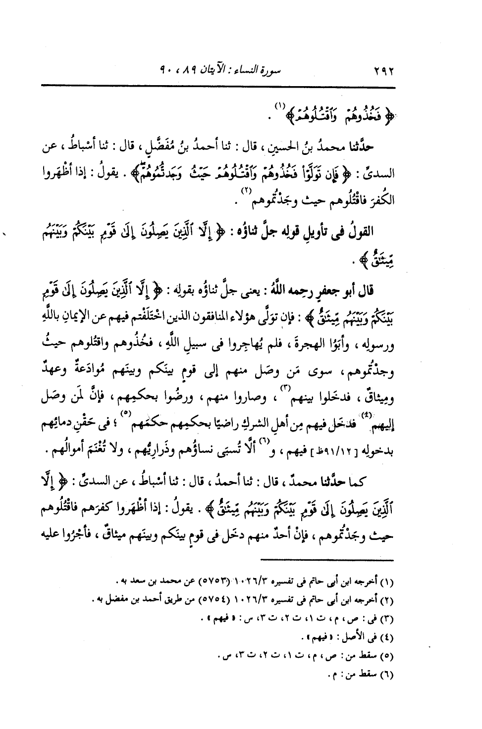 حَدَّثَنَا مُحَمَّدُ بْنُ الْحُسَيْنِ , قَالَ: ثنا أَحْمَدُ بْنُ مُفَضَّلٍ , قَالَ: ثنا أَسْبَاطٌ , عَنِ السُّدِّيِّ: {§فَإِنْ تَوَلَّوْا فَخُذُوهُمْ وَاقْتُلُوهُمْ حَيْثُ وَجَدْتُمُوهُمْ} [النساء: 89] يَقُولُ: «إِذَا أَظْهَرُوا كُفْرَهُمْ فَاقْتُلُوهُمْ حَيْثُ وَجَدْتُمُوهُمْ»