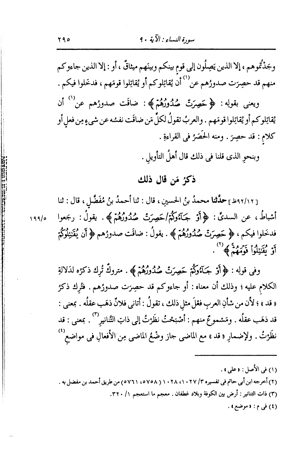 ذِكْرُ مَنْ قَالَ ذَلِكَ: حَدَّثَنَا مُحَمَّدُ بْنُ الْحُسَيْنِ , قَالَ: ثنا أَحْمَدُ بْنُ مُفَضَّلٍ , قَالَ: ثنا أَسْبَاطٌ , عَنِ السُّدِّيِّ: {§أَوْ جَاءُوكُمْ حَصِرَتْ صُدُورُهُمْ} يَقُولُ: «ضَاقَتْ صُدُورُهُمْ أَنْ يُقَاتِلُوكُمْ أَوْ يُقَاتِلُوا قَوْمَهُمْ» وَفِي قَوْلِهِ: {أَوْ جَاءُوكُمْ حَصِرَتْ صُدُورُهُمْ أَنْ يُقَاتِلُوكُمْ أَوْ يُقَاتِلُوا قَوْمَهُمْ} مَتْرُوكٌ , تُرِكَ ذِكْرُهُ لِدَلَالَةِ الْكَلَامِ عَلَيْهِ , وَذَلِكَ أَنَّ مَعْنَاهُ: أَوْ جَاءُوكُمْ قَدْ حَصِرَتْ صُدُورُهُمْ , فَتَرَكَ ذِكْرَ قَدْ لِأَنَّ مِنْ شَأْنِ الْعَرَبِ فِعْلَ مِثْلِ ذَلِكَ , تَقُولُ: أَتَانِي فُلَانٌ ذَهَبَ عَقْلُهُ , بِمَعْنَى: قَدْ ذَهَبَ عَقْلُهُ؛ وَمَسْمُوعٌ مِنْهُمْ: أَصْبَحْتُ نَظَرْتُ إِلَى ذَاتِ التَّنَانِيرِ , بِمَعْنَى: قَدْ نَظَرْتُ. ولِإِضْمَارِ قَدْ مَعَ الْمَاضِي جَازَ وَضْعُ الْمَاضِي مِنَ الْأَفْعَالِ فِي مَوْضِعِ