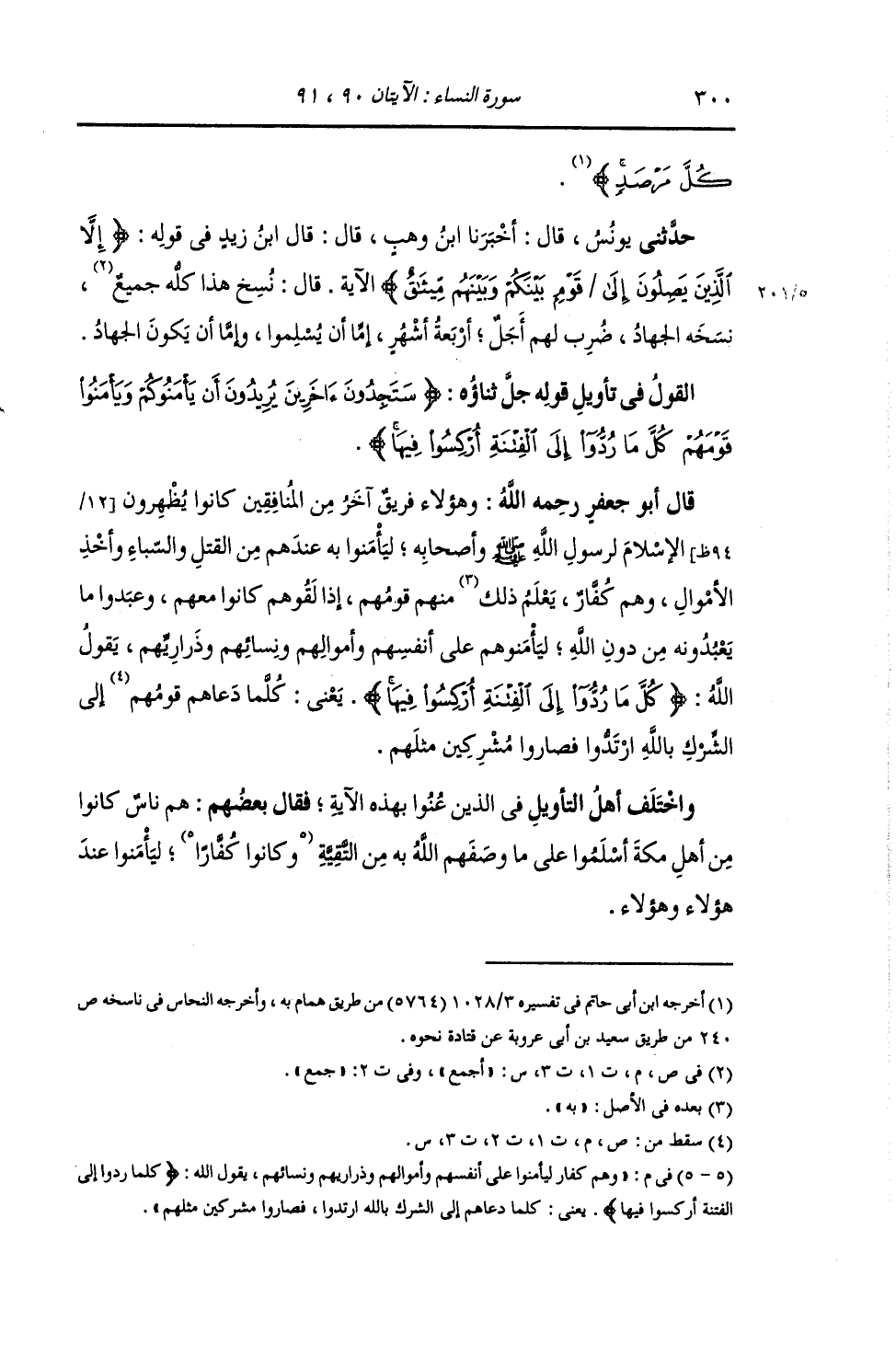 §الْقَوْلُ فِي تَأْوِيلِ قَوْلِهِ تَعَالَى: {سَتَجِدُونَ آخَرِينَ يُرِيدُونَ أَنْ يَأْمَنُوكُمْ وَيَأْمَنُوا قَوْمَهُمْ كُلَّمَا رُدُّوا إِلَى الْفِتْنَةِ أُرْكِسُوا فِيِهَا فَإِن لَّمْ يَعْتَزِلُوكُمْ وَيُلْقُوا إِلَيْكُمُ السَّلَمَ وَيَكُفُّوا أَيْدِيَهُمْ فَخُذُوهُمْ وَاقْتُلُوهُمْ حَيْثُ ثَقِفْتُمُوهُمْ وَأُولَئِكُمْ جَعَلْنَا لَكُمْ عَلَيْهِمْ سُلْطَانًا مُّبِينًا} وَهَؤُلَاءِ فَرِيقٌ آخَرُ مِنَ الْمُنَافِقِينَ كَانُوا يُظْهِرُونَ الْإِسْلَامَ لِرَسُولِ اللَّهِ صَلَّى اللهُ عَلَيْهِ وَسَلَّمَ وَأَصْحَابِهِ لِيَأْمَنُوا بِهِ عِنْدَهُمْ مِنَ الْقَتْلِ وَالسِّبَاءِ وَأَخْذِ الْأَمْوَالِ وَهُمْ كُفَّارٌ , يَعْلَمُ ذَلِكَ مِنْهُمْ قَوْمُهُمْ , إِذَا لَقُوهُمْ كَانُوا مَعَهُمْ وَعَبَدُوا مَا يَعْبُدُونَهُ مِنْ دُونِ اللَّهِ لَيَأْمَنُوهُمْ عَلَى أَنْفُسِهِمْ وَأَمْوَالِهِمْ وَنِسَائِهِمْ وَذَرَارِيِّهِمْ , يَقُولُ اللَّهُ: {كُلَّمَا رُدُّوا إِلَى الْفِتْنَةِ أُرْكِسُوا فِيهَا} يَعْنِي: " كُلَّمَا دَعَاهُمْ إِلَى الشِّرْكِ بِاللَّهِ ارْتَدُّوا فَصَارُوا مُشْرِكِينَ مِثْلَهُمْ. وَاخْتَلَفَ أَهْلُ التَّأْوِيلِ فِي الَّذِينَ عُنُوا بِهَذِهِ الْآيَةِ , فَقَالَ بَعْضُهُمْ: هُمْ نَاسٌ كَانُوا مِنْ أَهْلِ مَكَّةَ أَسْلَمُوا عَلَى مَا وَصَفَهُمُ اللَّهُ بِهِ مِنَ التُّقْيَةِ وَهُمْ كُفَّارٌ , لِيَأْمَنُوا عَلَى أَنْفُسِهِمْ وَأَمْوَالِهِمْ وَذَرَارِيِّهِمْ وَنِسَائِهِمْ , يَقُولُ اللَّهُ: {كُلَّمَا رُدُّوا إِلَى الْفِتْنَةِ أُرْكِسُوا فِيهَا} يَعْنِي: «كُلَّمَا دَعَاهُمْ إِلَى الشِّرْكِ بِاللَّهِ ارْتَدُّوا , فَصَارُوا مُشْرِكِينَ مِثْلَهُمْ لِيَأْمَنُوا عِنْدَ هَؤُلَاءِ وَهَؤُلَاءِ»