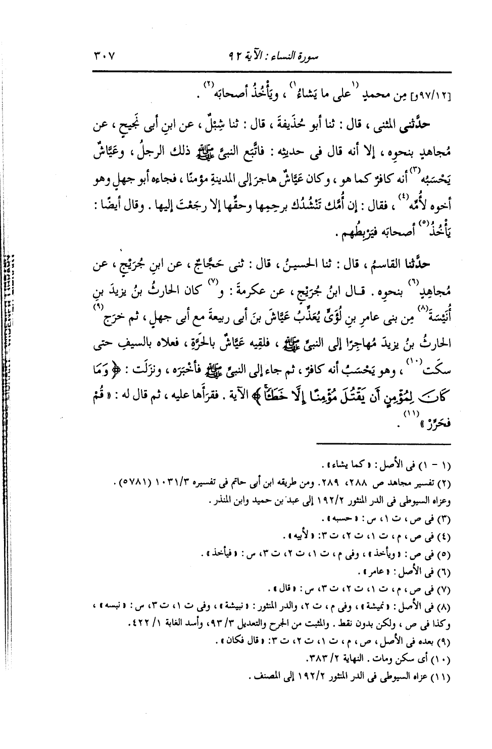قَالَ ابْنُ جُرَيْجٍ , عَنْ عِكْرِمَةَ , قَالَ: كَانَ الْحَارِثُ بْنُ يَزِيدَ بْنِ نُبَيْشَةَ مِنْ بَنِي عَامِرِ بْنِ لُؤَيٍّ يُعَذِّبُ عَيَّاشَ بْنَ أَبِي رَبِيعَةَ مَعَ أَبِي جَهْلٍ. ثُمَّ خَرَجَ الْحَارِثُ بْنُ يَزِيدَ مُهَاجِرًا إِلَى النَّبِيِّ صَلَّى اللهُ عَلَيْهِ وَسَلَّمَ , فَلَقِيَهُ عَيَّاشٌ بِالْحَرَّةِ فَعَلَاهُ بِالسَّيْفِ حَتَّى سَكَتَ , وَهُوَ يَحْسِبُ أَنَّهُ كَافِرٌ. ثُمَّ جَاءَ إِلَى النَّبِيِّ صَلَّى اللهُ عَلَيْهِ وَسَلَّمَ فَأَخْبَرَهُ , وَنَزَلَتْ: {§وَمَا كَانَ لِمُؤْمِنٍ أَنْ يَقْتُلَ مُؤْمِنًا إِلَّا خَطَأً} الْآيَةُ , فَقَرَأَهَا عَلَيْهِ , ثُمَّ قَالَ لَهُ: «قُمْ فَحَرِّرْ»