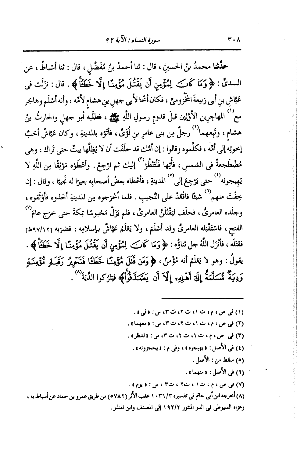 حَدَّثَنَا مُحَمَّدُ بْنُ الْحُسَيْنِ , قَالَ: ثنا أَحْمَدُ بْنُ مُفَضَّلٍ , قَالَ: ثنا أَسْبَاطٌ , عَنِ السُّدِّيِّ: {§وَمَا كَانَ لِمُؤْمِنٍ أَنْ يَقْتُلَ مُؤْمِنًا إِلَّا خَطَأً} قَالَ: " نَزَلَتْ فِي عَيَّاشِ بْنِ أَبِي رَبِيعَةَ الْمَخْزُومِيِّ , فَكَانَ أَخًا لِأَبِي جَهْلِ بْنِ هِشَامٍ لِأُمِّهِ. وَإِنَّهُ أَسْلَمَ وَهَاجَرَ فِي الْمُهَاجِرِينَ الْأَوَّلِينَ قَبْلَ قَدُومِ رَسُولِ اللَّهِ صَلَّى اللهُ عَلَيْهِ وَسَلَّمَ , فَطَلَبَهُ أَبُو جَهْلٍ وَالْحَارِثُ بْنُ هِشَامٍ وَمَعَهُمَا رَجُلٌ مِنْ بَنِي عَامِرِ بْنِ لُؤَيٍّ , فَأَتَوْهُ بِالْمَدِينَةِ , وَكَانَ عَيَّاشٌ أَحَبَّ إِخْوَتِهِ إِلَى أُمِّهِ , فَكَلَّمُوهُ وَقَالُوا: إِنَّ أُمَّكَ قَدْ حَلَفَتْ أَنْ لَا يُظِلَّهَا بَيْتٌ حَتَّى تَرَاكَ وَهِيَ مُضْطَجِعَةٌ فِي الشَّمْسِ , فَأْتِهَا لِتَنْظُرَ إِلَيْكَ ثُمَّ ارْجِعْ. وأَعْطَوْهُ مَوْثِقًا مِنَ اللَّهِ لَا يَحْجِزُونَهُ حَتَّى يَرْجِعَ إِلَى الْمَدِينَةِ. فأَعْطَاهُ بَعْضُ أَصْحَابِهِ بَعِيرًا لَهُ نَجِيبًا , وَقَالَ: إِنْ خِفْتَ مِنْهُمْ شَيْئًا فَاقْعُدْ عَلَى النَّجِيبِ. فَلَمَّا أَخْرَجُوهُ مِنَ الْمَدِينَةِ أَخَذُوهُ فَأَوْثَقُوهُ , وَجَلَدَهُ الْعَامِرِيُّ , فَحَلَفَ لَيَقْتُلَنَّ الْعَامِرِيَّ. فَلَمْ يَزَلْ مَحْبُوسًا بِمَكَّةَ حَتَّى خَرَجَ يَوْمَ الْفَتْحِ , فَاسْتَقْبَلَهُ الْعَامِرِيُّ وَقَدْ أَسْلَمَ وَلَا يَعْلَمُ عَيَّاشٌ بِإِسْلَامِهِ , فَضَرَبَهُ فَقَتَلَهُ , فَأَنْزَلَ اللَّهُ: {وَمَا كَانَ لِمُؤْمِنٍ أَنْ يَقْتُلَ مُؤْمِنًا إِلَّا خَطَأً} يَقُولُ: «وَهُوَ لَا يَعْلَمُ أَنَّهُ مُؤْمِنٌ {وَمَنْ قَتَلَ مُؤْمِنًا خَطَأً فَتَحْرِيرُ رَقَبَةٍ مُؤْمِنَةٍ وَدِيَةٌ مُسَلَّمَةٌ إِلَى أَهْلِهِ إِلَّا أَنْ يَصَّدَّقُوا} فَيَتْرُكُوا الدِّيَةَ»