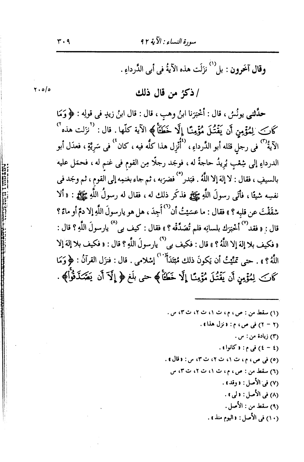 ذِكْرُ مَنْ قَالَ ذَلِكَ: حَدَّثَنِي يُونُسُ , قَالَ: أَخْبَرَنَا ابْنُ وَهْبٍ , قَالَ: قَالَ ابْنُ زَيْدٍ فِي قَوْلِهِ: {§وَمَا كَانَ لِمُؤْمِنٍ أَنْ يَقْتُلَ مُؤْمِنًا إِلَّا خَطَأً} الْآيَةُ. قَالَ: نَزَلَ هَذَا فِي رَجُلٍ قَتَلَهُ أَبُو الدَّرْدَاءِ كَانُوا فِي سَرِيَّةٍ , فَعَدَلَ أَبُو الدَّرْدَاءِ إِلَى شِعْبٍ يُرِيدُ حَاجَةً لَهُ , فَوَجَدَ رَجُلًا مِنَ الْقَوْمِ فِي غَنَمٍ لَهُ , فَحَمَلَ عَلَيْهِ بِالسَّيْفِ , فَقَالَ: لَا إِلَهَ إِلَّا اللَّهُ قَالَ: فَضَرَبَهُ ثُمَّ جَاءَ بِغَنَمِهِ إِلَى الْقَوْمِ. ثُمَّ وَجَدَ فِي نَفْسِهِ شَيْئًا , فَأَتَى النَّبِيَّ صَلَّى اللهُ عَلَيْهِ وَسَلَّمَ , فَذَكَرَ ذَلِكَ لَهُ , فَقَالَ لَهُ رَسُولُ اللَّهِ صَلَّى اللهُ عَلَيْهِ وَسَلَّمَ: «أَلَا شَقَقْتَ عَنْ قَلْبِهِ؟» فَقَالَ: مَا عَسَيْتَ أَجِدُ. هَلْ هُوَ يَا رَسُولَ اللَّهِ إِلَّا دَمٌ أَوْ مَاءٌ؟ قَالَ: «فَقَدْ أَخْبَرَكَ بِلِسَانِهِ فَلَمْ تُصَدِّقْهُ» قَالَ: كَيْفَ بِي يَا رَسُولَ اللَّهِ؟ قَالَ: «فَكَيْفَ بِلَا إِلَهَ إِلَّا اللَّهُ؟» قَالَ: فَكَيْفَ بِي يَا رَسُولَ اللَّهِ؟ قَالَ: «فَكَيْفَ بِلَا إِلَهَ إِلَّا اللَّهُ» حَتَّى تَمَنَّيْتُ أَنْ يَكُونَ ذَلِكَ مُبْتَدَأَ إِسْلَامِي. قَالَ: وَنَزَلَ الْقُرْآنُ: {وَمَا كَانَ لِمُؤْمِنٍ أَنْ يَقْتُلَ مُؤْمِنًا إِلَّا خَطَأً} حَتَّى بَلَغَ: {إِلَّا أَنْ يَصَّدَّقُوا} [النساء: 92]