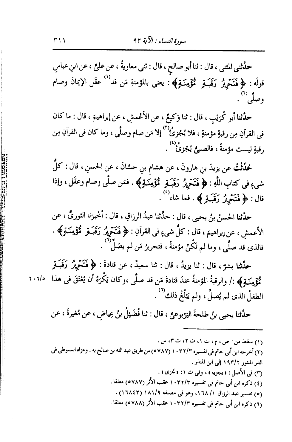 حَدَّثَنِي الْمُثَنَّى , قَالَ: ثنا أَبُو صَالِحٍ , قَالَ: ثني مُعَاوِيَةُ , عَنْ عَلِيِّ بْنِ أَبِي طَلْحَةَ , عَنِ ابْنِ عَبَّاسٍ , قَوْلُهُ: {§فَتَحْرِيرُ رَقَبَةٍ مُؤْمِنَةٍ} [النساء: 92] يَعْنِي بِالْمُؤْمِنَةِ: مَنْ عَقَلَ الْإِيمَانَ وَصَامَ وَصَلَّى "