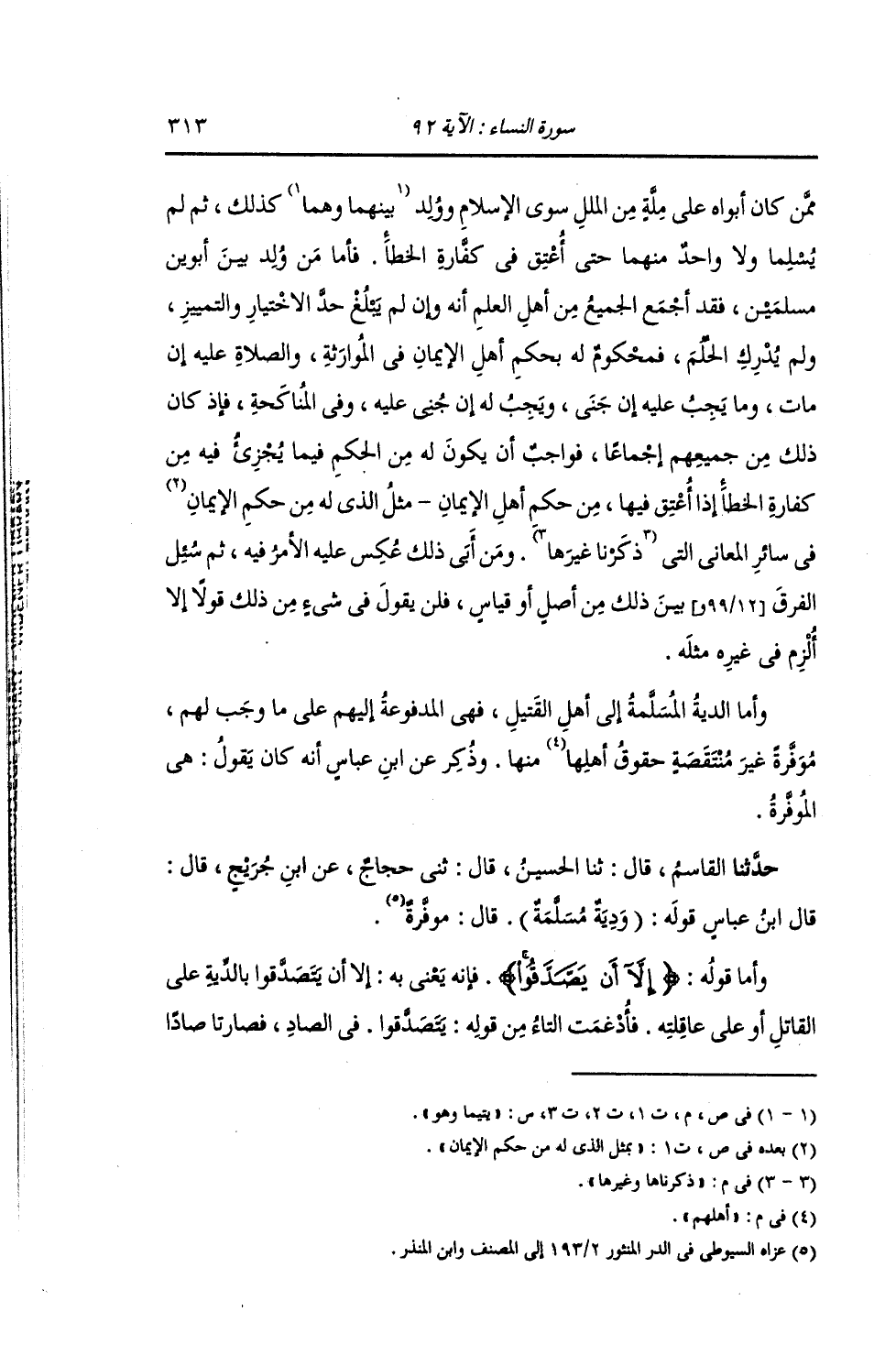 حَدَّثَنَا الْقَاسِمُ , قَالَ: ثنا الْحُسَيْنُ , قَالَ: ثني حَجَّاجٌ , عَنِ ابْنِ جُرَيْجٍ , قَالَ: قَالَ ابْنُ عَبَّاسٍ , قَوْلُهُ: {§وَدِيَةٌ مُسَلَّمَةٌ إِلَى أَهْلِهِ} [النساء: 92] قَالَ: «مُوَفَّرَةٌ» وَأَمَّا قَوْلُهُ: {إِلَّا أَنْ يَصَّدَّقُوا} [النساء: 92] فَإِنَّهُ يَعْنِي بِهِ: إِلَّا أَنْ يَتَصَدَّقُوا بِالدِّيَةِ عَلَى الْقَاتِلِ أَوْ عَلَى عَاقِلَتِهِ؛ فَأُدْغِمَتِ التَّاءُ مِنْ قَوْلِهِ: يَتَصَدَّقُوا فِي الصَّادِ فَصَارَتَا صَادًا. -[314]- وَقَدْ ذُكِرَ أَنَّ ذَلِكَ فِي قِرَاءَةِ أُبَيٍّ: «إِلَّا أَنْ يَتَصَدَّقُوا»