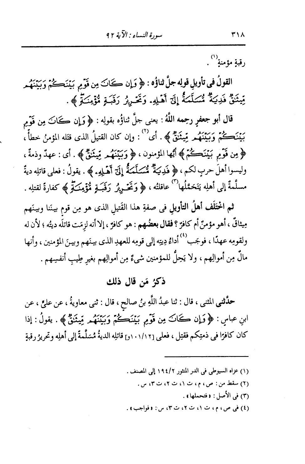 §الْقَوْلُ فِي تَأْوِيلِ قَوْلِهِ تَعَالَى: {وَإِنْ كَانَ مِنْ قَوْمٍ بَيْنَكُمْ وَبَيْنَهُمْ مِيثَاقٌ فَدِيَةٌ مُسَلَّمَةٌ إِلَى أَهْلِهِ وَتَحْرِيرُ رَقَبَةٍ مُؤْمِنَةٍ} [النساء: 92] يَعْنِي جَلَّ ثَنَاؤُهُ بِقَوْلِهِ: {وَإِنْ كَانَ مِنْ قَوْمٍ بَيْنَكُمْ وَبَيْنَهُمْ مِيثَاقٌ} [النساء: 92] وَإِنْ كَانَ الْقَتِيلُ الَّذِي قَتَلَهُ الْمُؤْمِنُ خَطَأً مِنْ قَوْمٍ بَيْنَكُمْ أَيُّهَا الْمُؤْمِنُونَ وَبَيْنَهُمْ مِيثَاقٌ: أَيْ عَهْدٌ وَذِمَّةٌ , وَلَيْسُوا أَهْلَ حَرْبٍ لَكُمْ , {فَدِيَةٌ مُسَلَّمَةٌ إِلَى أَهْلِهِ} [النساء: 92] يَقُولُ: " فَعَلَى قَاتِلِهِ دِيَةٌ مُسَلَّمَةٌ إِلَى أَهْلِهِ يَتَحَمَّلُهَا عَاقِلَتُهُ , وَتَحْرِيرُ رَقَبَةٍ مُؤْمِنَةٍ كَفَّارَةً لِقَتْلِهِ. ثُمَّ اخْتَلَفَ أَهْلُ التَّأْوِيلِ فِي صِفَةِ هَذَا الْقَتِيلِ الَّذِي هُوَ مِنْ قَوْمٍ بَيْنَنَا وَبَيْنَهُمْ مِيثَاقٌ أَهُوَ مُؤْمِنٌ أَوْ كَافِرٌ؟ فَقَالَ بَعْضُهُمْ: هُوَ كَافِرٌ , إِلَّا أَنَّهُ لَزِمَتْ قَاتِلَهُ دِيَتَهُ؛ لِأَنَّ لَهُ وَلِقَوْمِهِ عَهْدًا , فَوَاجِبٌ أَدَاءُ دِيَتِهِ إِلَى قَوْمِهِ لِلْعَهْدِ الَّذِي بَيْنَهُمْ وَبَيْنَ الْمُؤْمِنِينَ , وَأَنَّهَا مَالٌ مِنْ أَمْوَالِهِمْ , وَلَا يَحِلُّ لِلْمُؤْمِنِينَ شَيْءٌ مِنْ أَمْوَالِهِمْ بِغَيْرِ طِيبِ أَنْفُسِهِمْ
