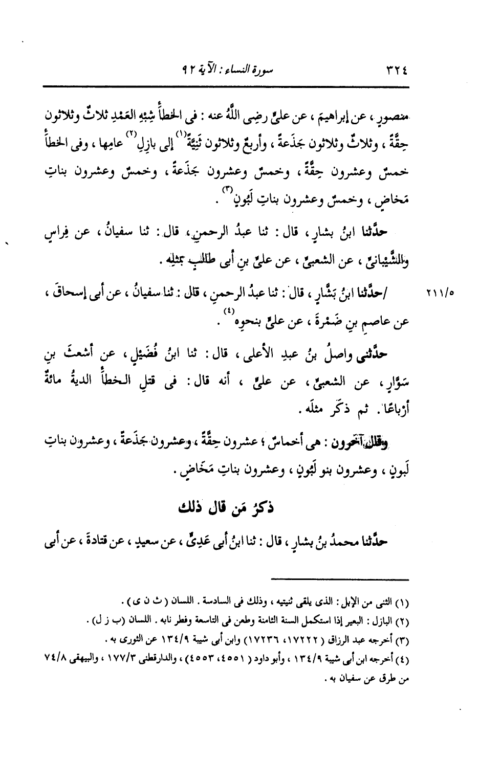 ذِكْرُ مَنْ قَالَ ذَلِكَ: حَدَّثَنَا مُحَمَّدُ بْنُ بَشَّارٍ , قَالَ: ثنا ابْنُ أَبِي عَدِيٍّ , عَنْ سَعِيدٍ , عَنْ قَتَادَةَ , عَنْ أَبِي -[325]- مِجْلَزٍ , عَنْ أَبِي عُبَيْدَةَ , عَنْ أَبِيهِ عَبْدِ اللَّهِ بْنِ مَسْعُودٍ , قَالَ: «فِي §الْخَطَأِ عِشْرُونَ حِقَّةً , وَعِشْرُونَ جَذَعَةً , وَعِشْرُونَ بَنَاتِ لَبُونٍ , وَعِشْرُونَ بَنِي لَبُونٍ , وَعِشْرُونَ بَنَاتِ مَخَاضٍ»