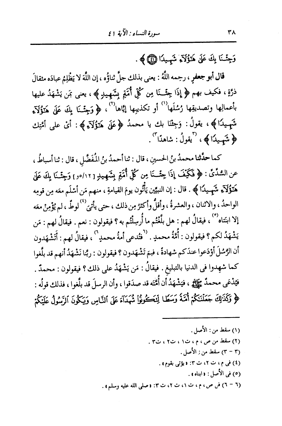 حَدَّثَنَا مُحَمَّدُ بْنُ الْحُسَيْنِ , قَالَ: ثنا أَحْمَدُ بْنُ مُفَضَّلٍ , قَالَ: ثنا أَسْبَاطٌ , عَنِ السُّدِّيِّ: {§فَكَيْفَ إِذَا جِئْنَا مِنْ كُلِّ أُمَّةٍ بِشَهِيدٍ وَجِئْنَا بِكَ عَلَى هَؤُلَاءِ شَهِيدًا} [النساء: 41] قَالَ: " إِنَّ النَّبِيِّينَ يَأْتُونَ يَوْمَ الْقِيَامَةِ , مِنْهُمْ مَنْ أَسْلَمَ مَعَهُ مِنْ قَوْمِهِ الْوَاحِدُ وَالِاثْنَانِ وَالْعَشَرَةُ وَأَقَلُّ وَأَكْثَرُ مِنْ ذَلِكَ , حَتَّى يُؤْتَى بِقَوْمِ لُوطٍ صَلَّى اللهُ عَلَيْهِ وَسَلَّمَ لَمْ يُؤْمِنْ مَعَهُ إِلَّا ابْنَتَاهُ , فَيُقَالَ لَهُمْ: هَلْ بَلَّغْتُمْ مَا أَرْسَلْتُمْ بِهِ؟ فَيَقُولُونَ: نَعَمْ , فَيُقَالَ: مَنْ يَشْهَدُ؟ فَيَقُولُونَ أُمَّةُ مُحَمَّدٍ صَلَّى اللهُ عَلَيْهِ وَسَلَّمَ فَيُقَالَ لَهُمْ: أَتَشْهَدُونَ أَنَّ الرُّسُلَ أَوْدَعُوا عِنْدَكُمْ شَهَادَةً , فَبِمَ تَشْهَدُونَ؟ فَيَقُولُونَ: رَبَّنَا نَشْهَدُ أَنَّهُمْ قَدْ بَلَّغُوا كَمَا شَهِدُوا فِي الدُّنْيَا بِالتَّبْلِيغِ. فَيُقَالَ: مَنْ يَشْهَدُ عَلَى ذَلِكَ؟ فَيَقُولُونَ: مُحَمَّدٌ صَلَّى اللهُ عَلَيْهِ وَسَلَّمَ. فيُدْعَى مُحَمَّدٌ عَلَيْهِ الصَّلَاةُ وَالسَّلَامُ , فَيَشْهَدُ أَنَّ أُمَّتَهُ قَدْ صَدَّقُوا , وَأَنَّ الرُّسُلَ قَدْ بَلَّغُوا. فَذَلِكَ قَوْلُهُ: {وَكَذَلِكَ جَعَلْنَاكُمْ أُمَّةً وَسَطًا لِتَكُونُوا شُهَدَاءَ عَلَى النَّاسِ وَيَكُونُ الرَّسُولُ عَلَيْكُمْ