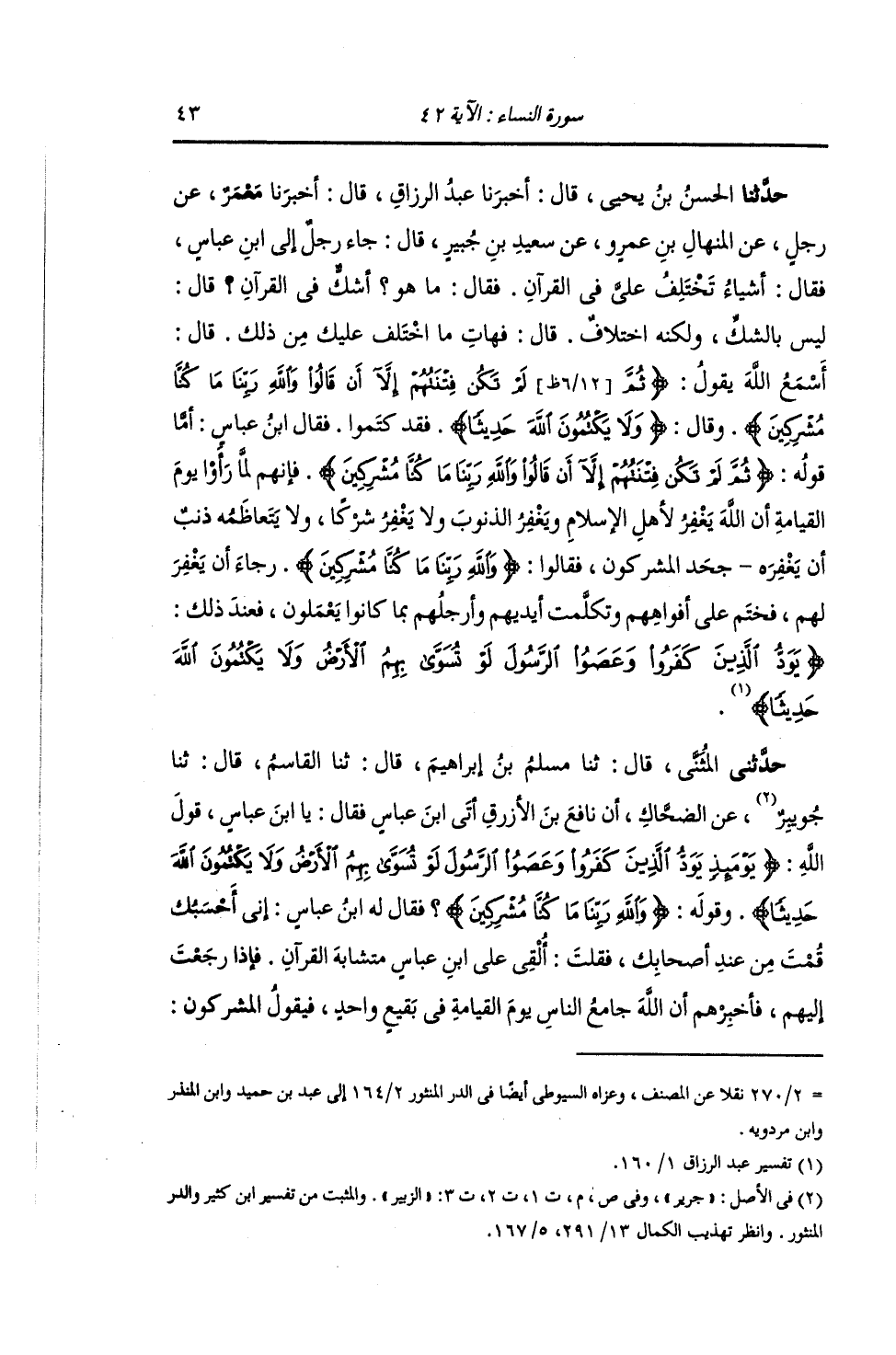 حَدَّثَنَا الْحَسَنُ بْنُ يَحْيَى , قَالَ: أَخْبَرَنَا عَبْدُ الرَّزَّاقِ , قَالَ: أَخْبَرَنَا مَعْمَرٌ , عَنْ رَجُلٍ , عَنِ الْمِنْهَالِ بْنِ عَمْرٍو , عَنْ سَعِيدِ بْنِ جُبَيْرٍ , قَالَ: جَاءَ رَجُلٌ إِلَى ابْنِ عَبَّاسٍ , فَقَالَ: أَشْيَاءُ تَخْتَلِفُ عَلَيَّ فِي الْقُرْآنِ؟ فَقَالَ: مَا هُوَ؟ أَشَكٌّ فِي الْقُرْآنِ؟ قَالَ: لَيْسَ بِالشَّكِّ , وَلَكِنَّهُ اخْتِلَافٌ. قَالَ: فَهَاتِ مَا اخْتَلَفَ عَلَيْكَ. قَالَ: أَسْمَعُ اللَّهَ يَقُولُ: {§ثُمَّ لَمْ تَكُنْ فِتْنَتُهُمْ إِلَّا أَنْ قَالُوا وَاللَّهِ رَبِّنَا مَا كُنَّا مُشْرِكِينَ} [الأنعام: 23] وَقَالَ: {وَلَا يَكْتُمُونَ اللَّهَ حَدِيثًا} [النساء: 42] وَقَدْ كَتَمُوا. فَقَالَ ابْنُ عَبَّاسٍ: أَمَّا قَوْلُهُ: {ثُمَّ لَمْ تَكُنْ فِتْنَتُهُمْ إِلَّا أَنْ قَالُوا وَاللَّهِ رَبِّنَا مَا كُنَّا مُشْرِكِينَ} [الأنعام: 23] فَإِنَّهُمْ لَمَّا رَأَوْا يَوْمَ الْقِيَامَةِ أَنَّ اللَّهَ يَغْفِرُ لِأَهْلِ الْإِسْلَامِ وَيَغْفِرُ الذُّنُوبَ وَلَا يَغْفِرُ شِرْكًا وَلَا يَتَعَاظَمُهُ ذَنْبٌ أَنْ يَغْفِرَهُ جَحَدَ الْمُشْرِكُونِ , فَقَالُوا: وَاللَّهِ رَبِّنَا مَا كُنَّا مُشْرِكِينَ , رَجَاءَ أَنْ يُغْفَرَ لَهُمْ , فَخُتِمَ عَلَى أَفْوَاهِهِمْ وَتَكَلَّمَتْ أَيْدِيهِمْ وَأَرْجُلُهُمْ بِمَا كَانُوا يَعْمَلُونَ , فَعِنْدَ ذَلِكَ {يَوَدُّ الَّذِينَ كَفَرُوا وَعَصَوُا الرَّسُولَ لَوْ تُسَوَّى بِهِمُ الْأَرْضُ وَلَا يَكْتُمُونَ اللَّهَ حَدِيثًا} [النساء: 42]