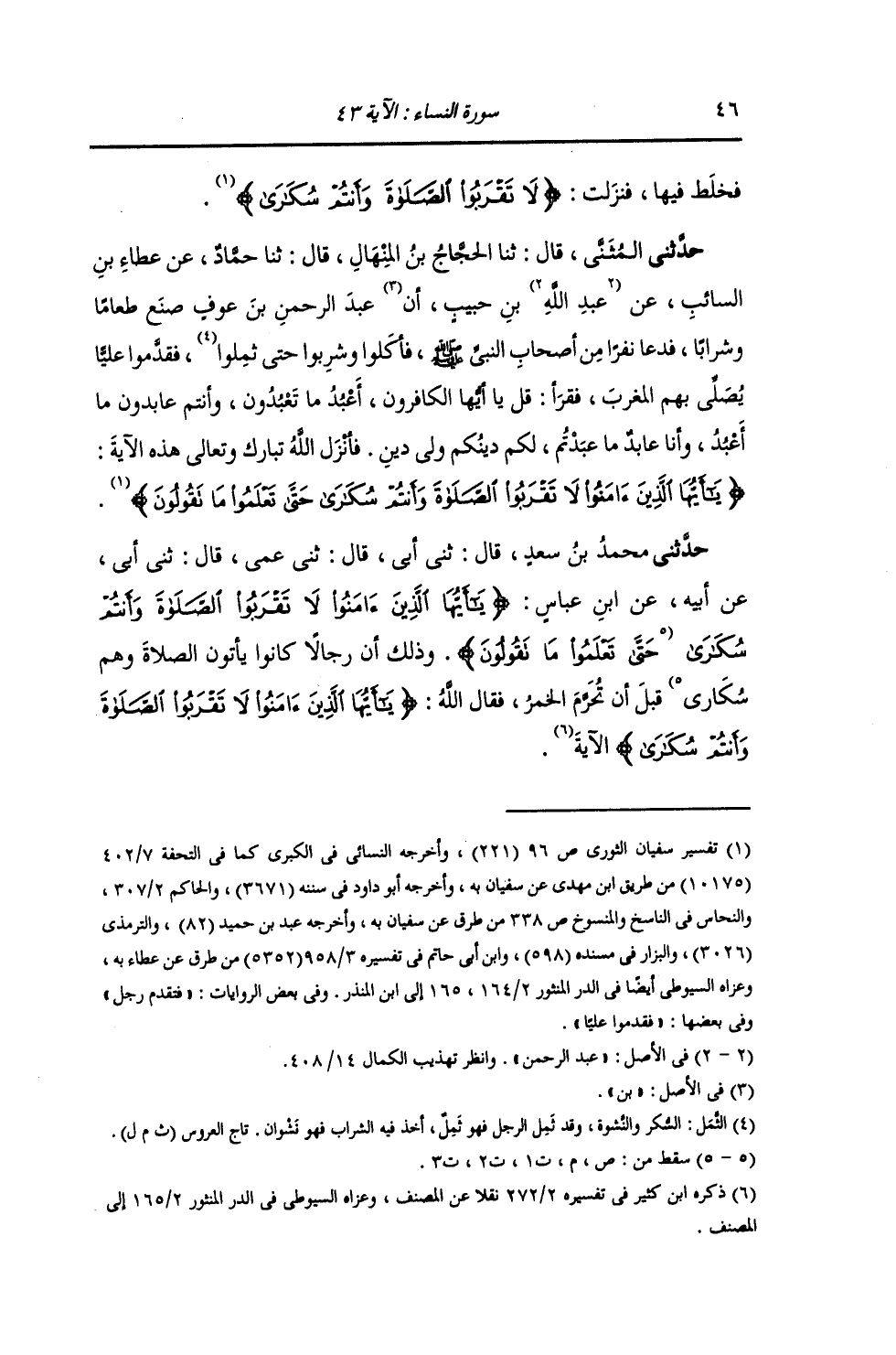حَدَّثَنِي الْمُثَنَّى , قَالَ: ثنا الْحَجَّاجُ بْنُ الْمِنْهَالِ , قَالَ: ثنا حَمَّادٌ , عَنْ عَطَاءِ بْنِ السَّائِبِ , عَنْ عَبْدِ اللَّهِ بْنِ حَبِيبٍ: أَنَّ عَبْدَ الرَّحْمَنِ بْنَ عَوْفٍ , صَنَعَ طَعَامًا وَشَرَابًا , فَدَعَا نَفَرًا مِنْ أَصْحَابِ النَّبِيِّ صَلَّى اللهُ عَلَيْهِ وَسَلَّمَ , فَأَكَلُوا وَشَرِبُوا حَتَّى ثَمِلُوا , فَقَدَّمُوا عَلِيًّا يُصَلِّي بِهِمُ الْمَغْرِبَ , فَقَرَأَ: «قُلْ يَا أَيُّهَا الْكَافِرُونَ , أَعْبُدُ مَا تَعْبُدُونَ , وَأَنْتُمْ عَابِدُونَ مَا أَعْبُدُ , وَأَنَا عَابِدٌ مَا عَبَدْتُمْ , لَكُمْ دِينُكُمْ وَلِيَ دِينِ» . فَأَنْزَلَ اللَّهُ تَبَارَكَ وَتَعَالَى هَذِهِ الْآيَةَ: {§لَا تَقْرَبُوا الصَّلَاةَ وَأَنْتُمْ سُكَارَى حَتَّى تَعْلَمُوا مَا تَقُولُونَ} [النساء: 43]