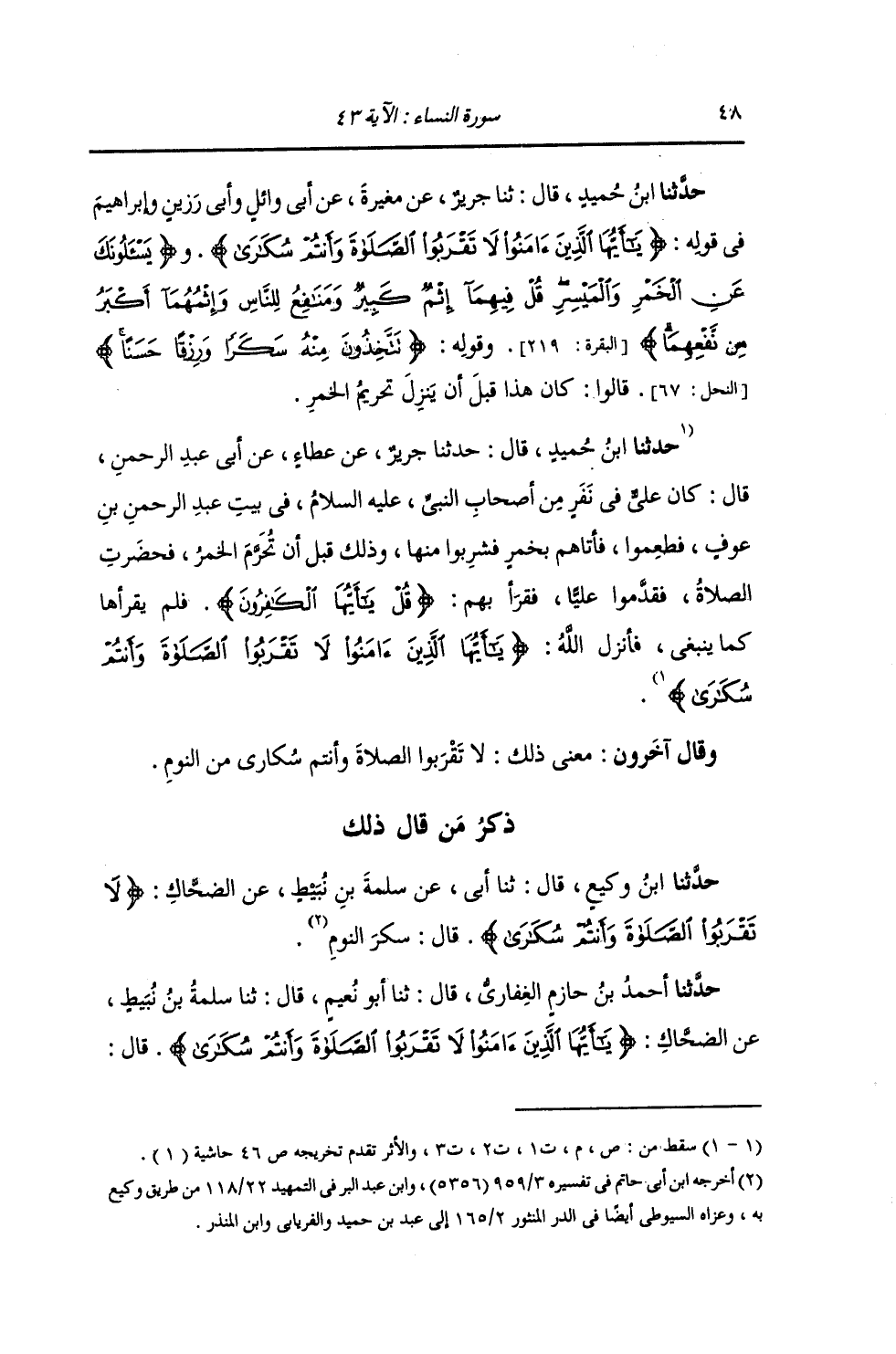حَدَّثَنَا ابْنُ حُمَيْدٍ , قَالَ: ثنا جَرِيرٌ , عَنْ مُغِيرَةَ , عَنْ أَبِي وَائِلٍ , وَأَبِي رَزِينٍ وَإِبْرَاهِيمَ فِي قَوْلِهِ: {§يَا أَيُّهَا الَّذِينَ آمَنُوا لَا تَقْرَبُوا الصَّلَاةَ وَأَنْتُمْ سُكَارَى} [النساء: 43] وَ {يَسْأَلُونَكَ عَنِ الْخَمْرِ وَالْمَيْسِرِ قُلْ فِيهِمَا إِثْمٌ كَبِيرٌ وَمَنَافِعُ لِلنَّاسِ وَإِثْمُهُمَا أَكْبَرُ مِنْ نَفْعِهِمَا} [البقرة: 219] وَقَوْلُهُ: {تَتَّخِذُونَ مِنْهُ سَكَرًا وَرِزْقًا حَسَنًا} [النحل: 67] قَالُوا: كَانَ هَذَا قَبْلَ أَنْ يَنْزِلَ تَحْرِيمُ الْخَمْرِ " وَقَالَ آخَرُونَ: مَعْنَى ذَلِكَ: لَا تَقْرَبُوا الصَّلَاةَ وَأَنْتُمْ سُكَارَى مِنَ النَّوْمِ