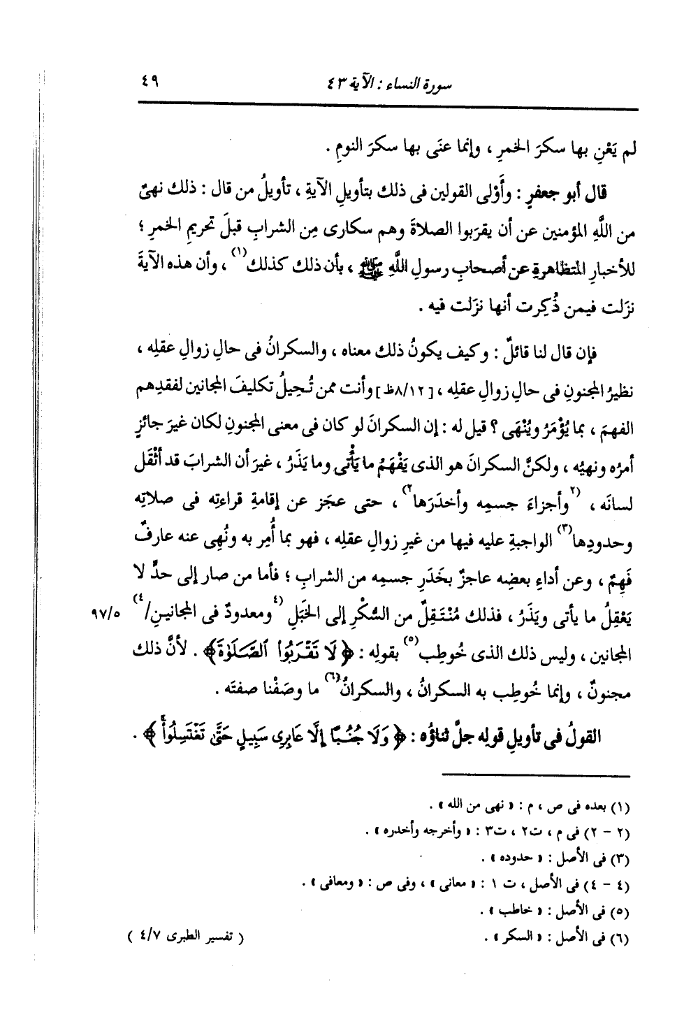 لَمْ يَعْنِ بِهَا سَكَرَ الْخَمْرِ , وَإِنَّمَا عَنَى بِهَا سَكَرَ النَّوْمِ» قَالَ أَبُو جَعْفَرٍ: وَأَوْلَى الْقَوْلَيْنِ فِي ذَلِكَ بِتَأْوِيلِ الْآيَةِ , تَأْوِيلُ مَنْ قَالَ ذَلِكَ نَهْي مِنَ اللَّهِ الْمُؤْمِنِينَ عَنْ أَنْ يَقْرَبُوا الصَّلَاةَ وَهُمْ سُكَارَى مِنَ الشَّرَابِ قَبْلَ تَحْرِيمِ الْخَمْرِ , لِلْأَخْبَارِ الْمُتَظَاهِرَةِ عَنْ أَصْحَابِ رَسُولِ اللَّهِ صَلَّى اللهُ عَلَيْهِ وَسَلَّمَ بِأَنَّ ذَلِكَ كَذَلِكَ نَهْي مِنَ اللَّهِ , وَأَنَّ هَذِهِ الْآيَةِ نَزَلَتْ فِيمَنْ ذَكَرْتُ أَنَّهَا نَزَلَتْ فِيهِ. فَإِنْ قَالَ لَنَا قَائِلٌ: وَكَيْفَ يَكُونُ ذَلِكَ مَعْنَاهُ , وَالسَّكْرَانُ فِي حَالِ زَوَالِ عَقْلِهِ نَظِيرُ الْمَجْنُونِ فِي حَالِ زَوَالِ عَقْلِهِ , وَأَنْتَ مِمَّنْ تُحِيلُ تَكْلِيفَ الْمَجَانِينَ لِفَقْدِهِمُ الْفَهْمَ بِمَا يُؤْمَرُ وَيُنْهَى؟ قِيلَ لَهُ: إِنَّ السَّكْرَانَ لَوْ كَانَ فِي مَعْنَى الْمَجْنُونِ لَكَانَ غَيْرَ جَائِزٍ أَمْرُهُ وَنَهْيُهُ , وَلَكِنَّ السَّكْرَانَ هُوَ الَّذِي يَفْهَمُ مَا يَأْتِي وَيَذَرُ , غَيْرَ أَنَّ الشَّرَابَ قَدْ أَثْقَلَ لِسَانِهِ وَأَحَرَّ جِسْمَهُ وَأَخْدَرَهُ , حَتَّى عَجَزَ عَنْ إِقَامَةِ قِرَاءَتِهِ فِي صَلَاتِهِ وَحُدُودِهَا الْوَاجِبَةِ عَلَيْهِ فِيهَا مِنْ غَيْرِ زَوَالِ عَقْلِهِ , فَهُوَ بِمَا أُمِرَ بِهِ وَنُهِيَ عَنْهُ عَارِفٌ فَهِمٌ , وَعَنْ أَدَاءِ بَعْضِهِ عَاجِزٌ بِخَدَرِ جِسْمِهِ مِنَ الشَّرَابِ. وَأَمَّا مَنْ صَارَ إِلَى حَدٍّ لَا يَعْقِلُ مَا يَأْتِي وَيَذَرُ , فَذَلِكَ مُنْتَقِلٌ مِنَ السَّكَرِ إِلَى الْخَبْلِ , وَمَعْدُودٌ فِي الْمَجَانِينِ , وَلَيْسَ ذَلِكَ الَّذِي خُوطِبَ بِقَوْلِهِ: {لَا تَقْرَبُوا الصَّلَاةَ} [النساء: 43] لِأَنَّ ذَلِكَ مَجْنُونٌ , وَإِنَّمَا خُوطِبَ بِهِ السَّكْرَانُ , وَالسَّكْرَانِ مَا وَصَفْنَا صِفَتَهُ