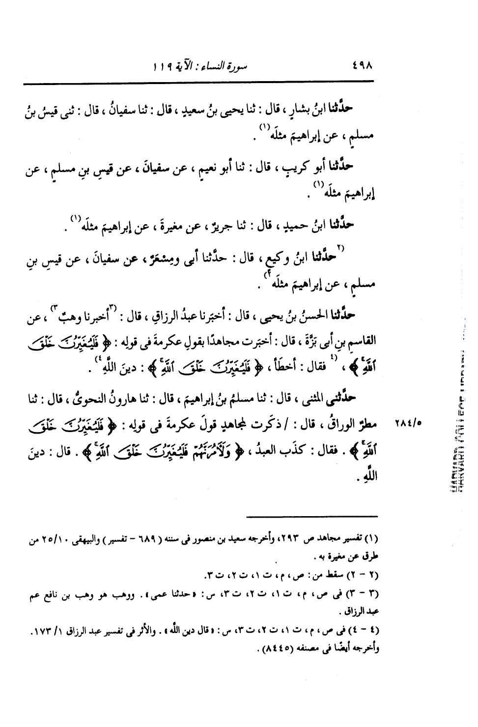 حَدَّثَنِي الْمُثَنَّى , قَالَ: ثنا مُسْلِمُ بْنُ إِبْرَاهِيمَ , قَالَ: ثنا هَارُونُ النَّحْوِيُّ , قَالَ: ثنا الْوَرَّاقُ , قَالَ: ذَكَرْتُ لِمُجَاهِدٍ قَوْلَ عِكْرِمَةَ فِي قَوْلِهِ: {§فَلَيُغَيِّرُنَّ خَلْقَ اللَّهِ} [النساء: 119] فَقَالَ: كَذَبَ الْعَبْدُ {وَلَآمُرَنَّهُمْ فَلَيُغَيِّرُنَّ خَلْقَ اللَّهِ} [النساء: 119] قَالَ: «دِينَ اللَّهِ»