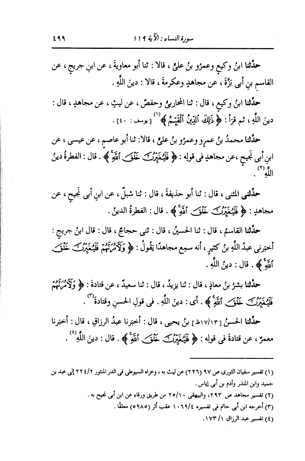 حَدَّثَنَا مُحَمَّدُ بْنُ عَمْرٍو , وَعَمْرُو بْنُ عَلِيٍّ , قَالَا: ثنا أَبُو عَاصِمٍ , عَنْ عِيسَى , عَنِ ابْنِ أَبِي نَجِيحٍ , عَنْ مُجَاهِدٍ , فِي قَوْلِهِ: {§فَلَيُغَيِّرُنَّ خَلْقَ اللَّهِ} [النساء: 119] قَالَ: «الْفِطْرَةُ دِينُ اللَّهِ»