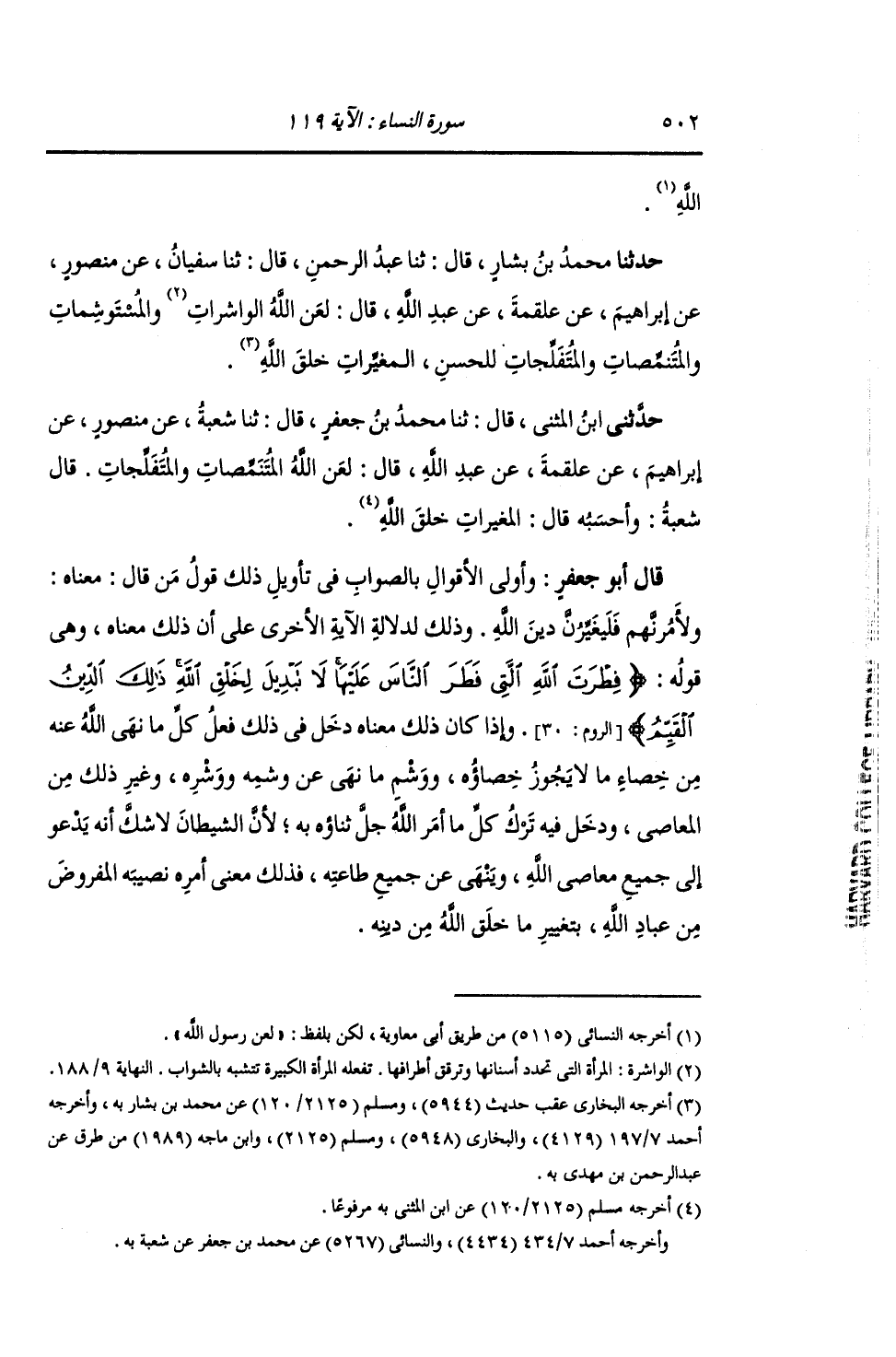 حَدَّثَنَا ابْنُ الْمُثَنَّى , قَالَ: ثنا مُحَمَّدُ بْنُ جَعْفَرٍ , قَالَ: ثنا شُعْبَةُ , عَنْ مَنْصُورٍ , عَنْ إِبْرَاهِيمَ , عَنْ عَلْقَمَةَ عَنْ عَبْدِ اللَّهِ , قَالَ: " §لَعَنَ اللَّهُ الْمُتَنَمِّصَاتِ وَالْمُتَفَلِّجَاتِ , قَالَ شُعْبَةُ: وَأَحْسِبُهُ قَالَ: الْمُغَيِّرَاتِ خَلْقَ اللَّهِ قَالَ أَبُو جَعْفَرٍ: وَأَوْلَى الْأَقْوَالِ بِالصَّوَابِ فِي تَأْوِيلِ ذَلِكَ قَوْلُ مَنْ قَالَ: مَعْنَاهُ: وَلَآمُرَنَّهُمْ فَلَيُغَيِّرُنَّ خَلْقَ اللَّهِ , قَالَ: دِينَ اللَّهِ , وَذَلِكَ لِدَلَالَةِ الْآيَةِ الْأُخْرَى عَلَى أَنَّ ذَلِكَ مَعْنَاهُ , وَهِيَ قَوْلُهُ: {فِطْرَةَ اللَّهِ الَّتِي فَطَرَ النَّاسَ عَلَيْهَا لَا تَبْدِيلَ لِخَلْقِ اللَّهِ ذَلِكَ الدِّينُ الْقَيِّمُ} [الروم: 30] وَإِذَا كَانَ ذَلِكَ مَعْنَاهُ دَخَلَ فِي ذَلِكَ فِعْلُ كُلِّ مَا نَهَى اللَّهُ عَنْهُ مِنْ خِصَاءِ مَا لَا يَجُوزُ خِصَاؤُهُ , وَوَشْمِ مَا نَهَى عَنْ وَشِمِهْ وَوَشْرِهِ , وَغَيْرِ ذَلِكَ مِنَ الْمَعَاصِي , وَدَخَلَ فِيهِ تَرْكُ كُلِّ مَا أَمَرَ اللَّهُ بِهِ , لِأَنَّ الشَّيْطَانَ لَا شَكَّ أَنَّهُ يَدْعُو إِلَى جَمِيعِ مَعَاصِي اللَّهِ , وَيَنْهَى عَنْ جَمِيعِ طَاعَتِهِ , فَذَلِكَ مَعْنَى أَمْرِهِ نَصِيبَهُ الْمَفْرُوضَ مِنْ عِبَادِ اللَّهِ بِتَغْيِيرِ مَا خَلَقَ اللَّهُ مِنْ دِينِهِ؛ -[503]- وَلَا مَعْنَى لِتَوْجِيهِ مَنْ وَجَّهَ قَوْلَهُ: {وَلَآمُرَنَّهُمْ فَلَيُغَيِّرُنَّ خَلْقَ اللَّهِ} [النساء: 119] إِلَى أَنَّهُ وَعْدَ الْأَمْرَ بِتَغْيِيرِ بَعْضِ مَا نَهَى اللَّهُ عَنْهُ دُونَ بَعْضٍ , أَوْ بَعْضِ مَا أَمَرَ بِهِ دُونَ بَعْضٍ. فَإِذْ كَانَ الَّذِي وَجَّهَ مَعْنَى ذَلِكَ إِلَى الْخِصَاءِ وَالْوَشْمِ دُونَ غَيْرِهِ , إِنَّمَا فَعَلَ ذَلِكَ لِأَنَّ مَعْنَاهُ: كَانَ عِنْدَهُ أَنَّهُ عَنَى بِهِ تَغْيِيرَ الْأَجْسَامِ , فَإِنَّ فِي قَوْلِهِ جَلَّ ثَنَاؤُهُ إِخْبَارًا عَنْ قِيلِ الشَّيْطَانِ: {وَلَآمُرَنَّهُمْ فَلَيُغَيِّرُنَّ خَلْقَ اللَّهِ} [النساء: 119] مَا يُنْبِئُ أَنَّ مَعْنَى ذَلِكَ غَيْرُ مَا ذَهَبَ إِلَيْهِ , لِأَنَّ تَبْتِيكَ آذَانِ الْأَنْعَامِ مِنْ تَغْيِيرِ خَلْقِ اللَّهِ , الَّذِي هُوَ أَجْسَامٌ. وَقَدْ مَضَى الْخَبَرُ عَنْهُ أَنَّهُ وَعَدَ الْأَمْرَ بِتَغْيِيرِ خَلْقِ اللَّهِ مِنَ الْأَجْسَامِ مُفَسَّرًا , فَلَا وَجْهَ لِإِعَادَةِ الْخَبَرِ عَنْهُ بِهِ مُجْمَلًا , إِذْ كَانَ الْفَصِيحُ فِي كَلَامِ الْعَرَبِ أَنْ يُتَرْجَمَ عَنِ الْمُجْمَلِ مِنَ الْكَلَامِ بِالْمُفَسَّرِ وَبِالْخَاصِ عَنِ الْعَامِ دُونَ التَّرْجَمَةِ عَنِ الْمُفَسَّرِ بِالْمُجْمَلِ , وَبِالْعَامِ عَنِ الْخَاصِّ , وَتَوْجِيهُ كِتَابِ اللَّهِ إِلَى الْأَفْصَحِ مِنَ الْكَلَامِ أَوْلَى مِنْ تَوْجِيهِهِ إِلَى غَيْرِهِ مَا وُجِدَ إِلَيْهِ السَّبِيلُ