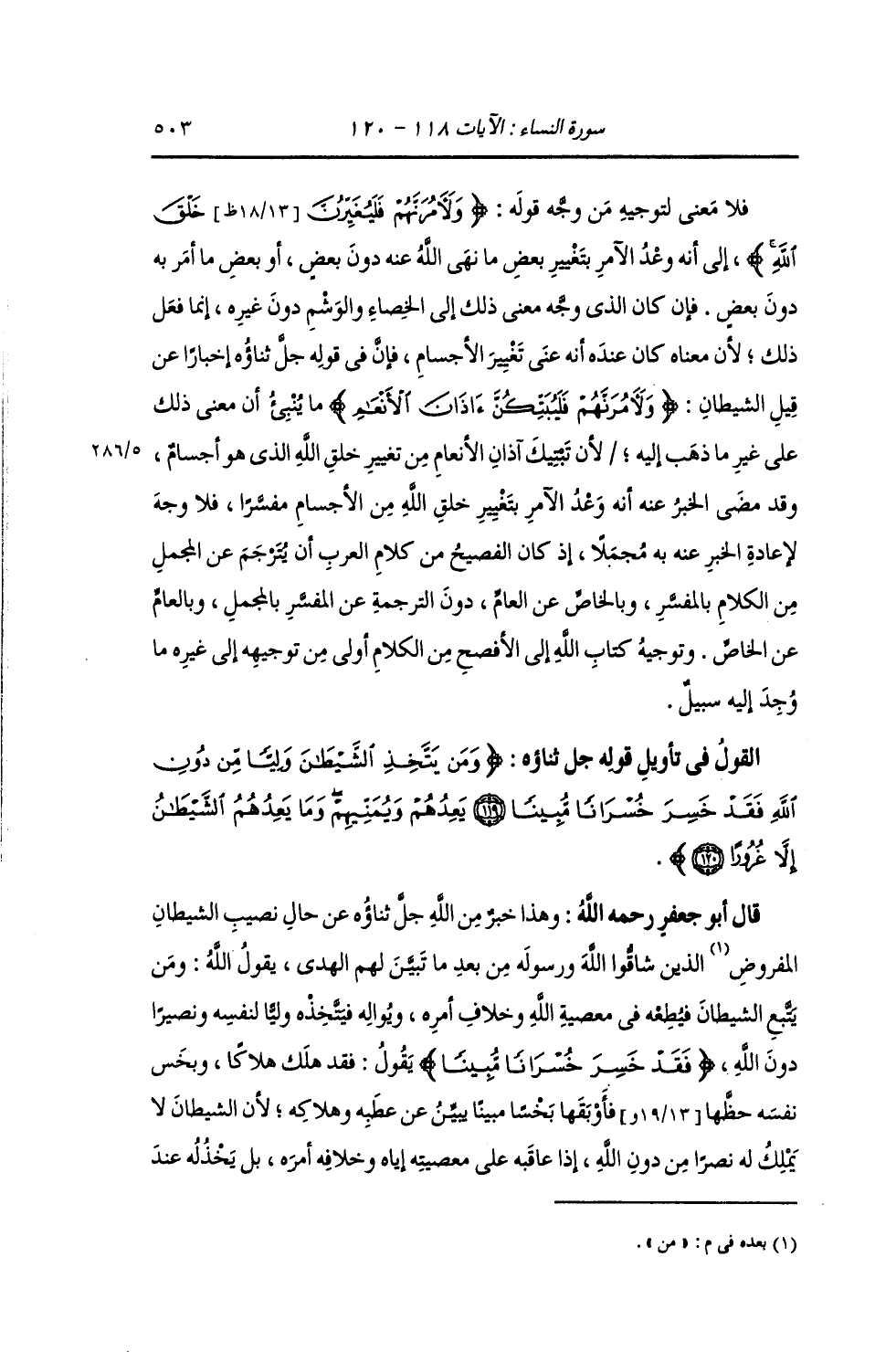§الْقَوْلُ فِي تَأْوِيلِ قَوْلِهِ تَعَالَى: {وَمَنْ يَتَّخِذِ الشَّيْطَانَ وَلِيًّا مِنْ دُونِ اللَّهِ فَقَدْ خَسِرَ خُسْرَانًا مُبِينًا يَعِدُهُمْ وَيُمَنِّيهِمْ وَمَا يَعِدُهُمُ الشَّيْطَانُ إِلَّا غُرُورًا} [النساء: 120] وَهَذَا خَبَرٌ مِنَ اللَّهِ جَلَّ ثَنَاؤُهُ عَنْ حَالِ نَصِيبِ الشَّيْطَانِ الْمَفْرُوضِ مِنَ الَّذِينَ شَاقُّوا اللَّهَ وَرَسُولَهُ مِنْ بَعْدِ مَا تَبَيَّنَ لَهُمُ الْهُدَى , يَقُولُ اللَّهُ: وَمَنْ يَتَّبِعِ الشَّيْطَانَ فَيُطِيعُهُ فِي مَعْصِيَةِ اللَّهِ , وَخِلَافِ أَمْرِهِ , وَيُوَالِيهِ فَيَتَّخِذُهُ وَلِيًّا لِنَفْسِهِ وَنَصِيرًا دُونَ اللَّهِ {فَقَدْ خَسِرَ خُسْرَانًا مُبِينًا} [النساء: 119] يَقُولُ: " فَقَدْ هَلَكَ هَلَاكًا , وَبَخَسَ نَفْسُهُ حَظَّهَا فَأَوْبَقَهَا بَخْسًا مُبِينًا يُبِينُ عَنْ عَطِبِهِ وَهَلَاكِهِ , لِأَنَّ الشَّيْطَانَ لَا يَمْلِكُ لَهُ نَصْرًا مِنَ اللَّهِ إِذَا عَاقَبَهُ عَلَى مَعْصِيَتِهِ إِيَّاهُ فِي خِلَافِهِ أَمْرَهُ , بَلْ يَخْذُلُهُ عِنْدَ
