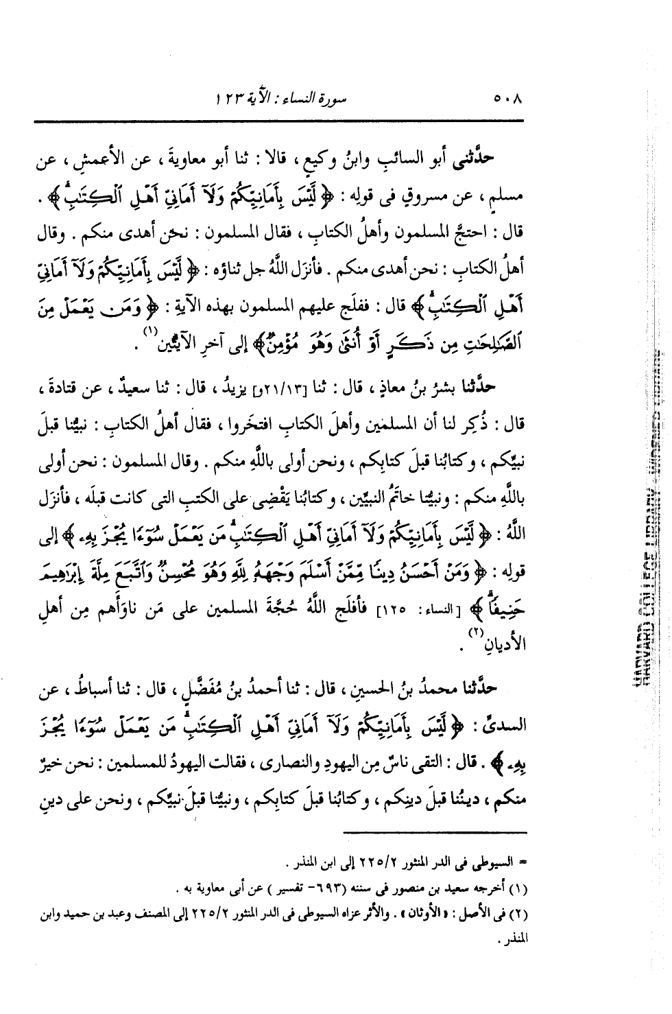 حَدَّثَنَا بِشْرُ بْنُ مُعَاذٍ , قَالَ: ثنا يَزِيدُ , قَالَ: ثنا سَعِيدٌ , عَنْ قَتَادَةَ , قَالَ: ذُكِرَ لَنَا أَنَّ الْمُسْلِمِينَ , وَأَهْلُ الْكِتَابِ افْتَخَرُوا , فَقَالَ أَهْلُ الْكِتَابِ: نَبِيُّنَا قَبْلَ نَبِيِّكُمْ , وَكِتَابُنَا قَبْلَ كِتَابِكُمْ , وَنَحْنُ أَوْلَى بِاللَّهِ مِنْكُمْ. وَقَالَ الْمُسْلِمُونَ: نَحْنُ أَوْلَى بِاللَّهِ مِنْكُمْ , نَبِيُّنَا خَاتَمُ النَّبِيِّينَ , وَكِتَابُنَا يَقْضِي عَلَى الْكُتُبِ الَّتِي كَانَتْ قَبْلَهُ. فَأَنْزَلَ اللَّهُ: {§لَيْسَ بِأَمَانِيِّكُمْ وَلَا أَمَانِيِّ أَهْلِ الْكِتَابِ , مَنْ يَعْمَلْ سُوءًا يُجْزَ بِهِ} [النساء: 123] إِلَى قَوْلِهِ: {وَمَنْ أَحْسَنُ دِينًا مِمَّنْ أَسْلَمَ وَجْهَهُ لِلَّهِ وَهُوَ مُحْسِنٌ وَاتَّبَعَ مِلَّةَ إِبْرَاهِيمَ حَنِيفًا} [النساء: 125] فَأَفْلَجَ اللَّهُ حُجَّةَ الْمُسْلِمِينَ عَلَى مَنْ نَاوَأَهُمْ مِنْ أَهْلِ الْأَدْيَانِ "