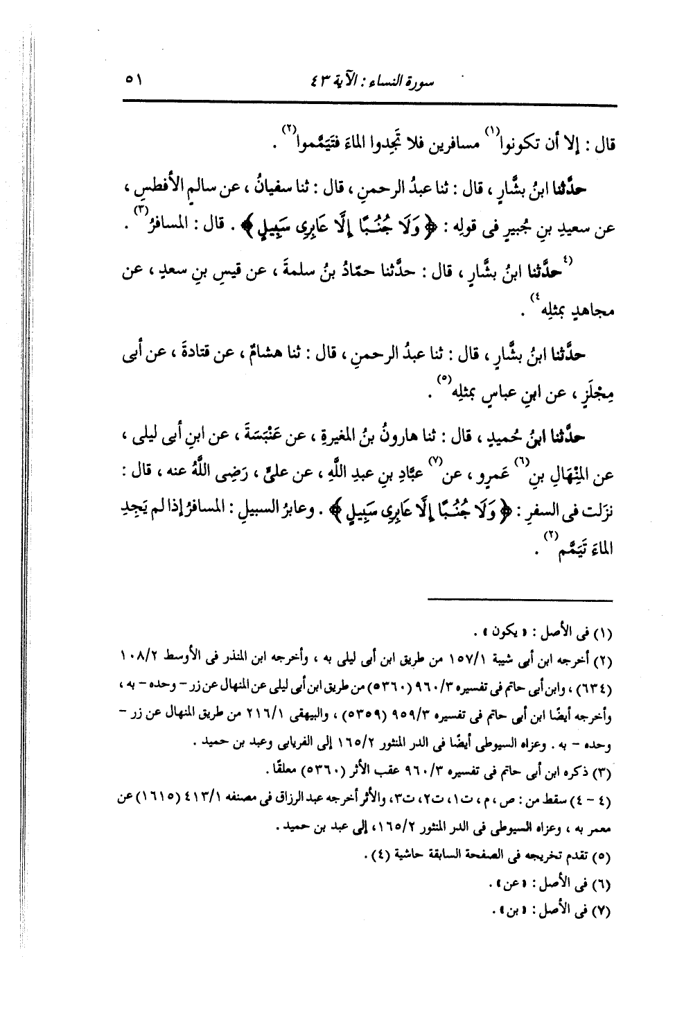 حَدَّثَنَا ابْنُ بَشَّارٍ , قَالَ: ثنا عَبْدُ الرَّحْمَنِ , قَالَ: ثنا سُفْيَانُ , عَنْ سَالِمٍ الْأَفْطَسِ , عَنْ سَعِيدِ بْنِ جُبَيْرٍ , فِي قَوْلِهِ: {§وَلَا جُنُبًا} [النساء: 43] إِلَّا عَابِرِي سَبِيلٍ قَالَ: «الْمُسَافِرُ» حَدَّثَنَا ابْنُ بَشَّارٍ قَالَ: ثنا عَبْدُ الرَّحْمَنِ قَالَ: ثنا هِشَامٌ , عَنْ قَتَادَةَ , عَنْ أَبِي مِجْلَزٍ , عَنِ ابْنِ عَبَّاسٍ , بِمِثْلِهِ