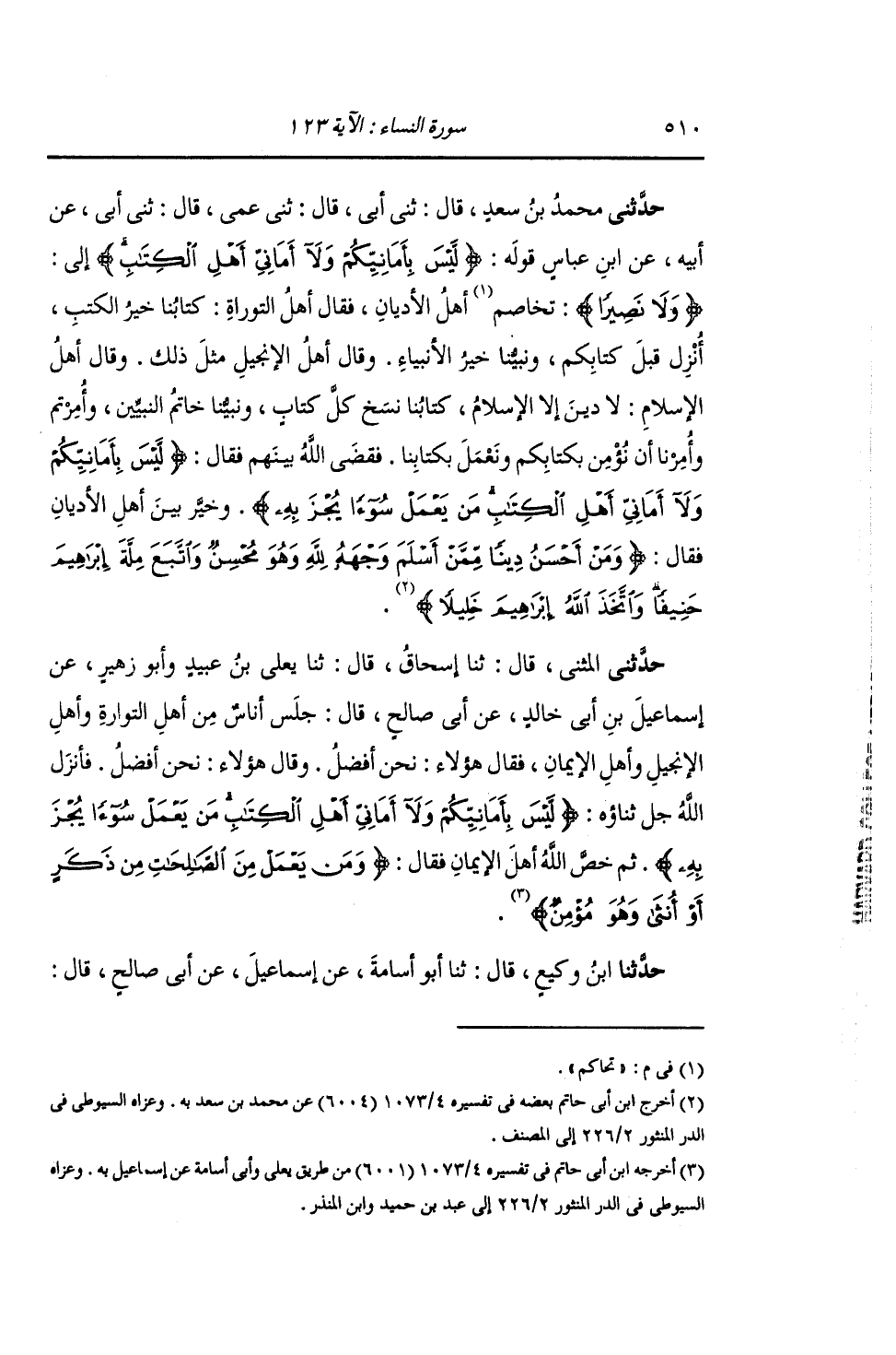 حَدَّثَنِي مُحَمَّدُ بْنُ سَعْدٍ , قَالَ: ثني أَبِي قَالَ: ثني عَمِّي , قَالَ: ثني أَبِي عَنْ أَبِيهِ , عَنِ ابْنِ عَبَّاسٍ , قَوْلُهُ: {§لَيْسَ بِأَمَانِيِّكُمْ وَلَا أَمَانِيِّ أَهْلِ الْكِتَابِ} [النساء: 123] إِلَى: {وَلَا نَصِيرًا} [النساء: 89] تَحَاكَمَ أَهْلُ الْأَدْيَانِ , فَقَالَ أَهْلُ التَّوْرَاةِ: كِتَابُنَا خَيْرٌ مِنَ الْكُتُبِ , أُنْزِلَ قَبْلَ كِتَابِكُمْ , وَنَبِيُّنَا خَيْرُ الْأَنْبِيَاءِ. وَقَالَ أَهْلُ الْإِنْجِيلِ مِثْلَ ذَلِكَ. وَقَالَ أَهْلُ الْإِسْلَامِ: لَا دِينَ إِلَّا الْإِسْلَامُ , كِتَابُنَا نَسَخَ كُلَّ كِتَابٍ , وَنَبِيُّنَا خَاتَمُ النَّبِيِّينَ , وَأُمِرْتُمْ وَأُمِرْنَا أَنْ نُؤْمِنَ بِكِتَابِكُمْ , وَنَعْمَلَ بِكِتَابِنَا. فقَضَى اللَّهُ بَيْنَهُمْ فَقَالَ: {لَيْسَ بِأَمَانِيِّكُمْ وَلَا أَمَانِيِّ أَهْلِ الْكِتَابِ مَنْ يَعْمَلْ سُوءًا يُجْزَ} [النساء: 123] بِهِ وَخَيَّرَ بَيْنَ أَهْلِ الْأَدْيَانِ فَقَالَ: {وَمَنْ أَحْسَنُ دِينًا مِمَّنْ أَسْلَمَ وَجْهَهُ لِلَّهِ وَهُوَ مُحْسِنٌ وَاتَّبَعَ مِلَّةَ إِبْرَاهِيمَ حَنِيفًا وَاتَّخَذَ اللَّهُ إِبْرَاهِيمَ خَلِيلًا} [النساء: 125] "