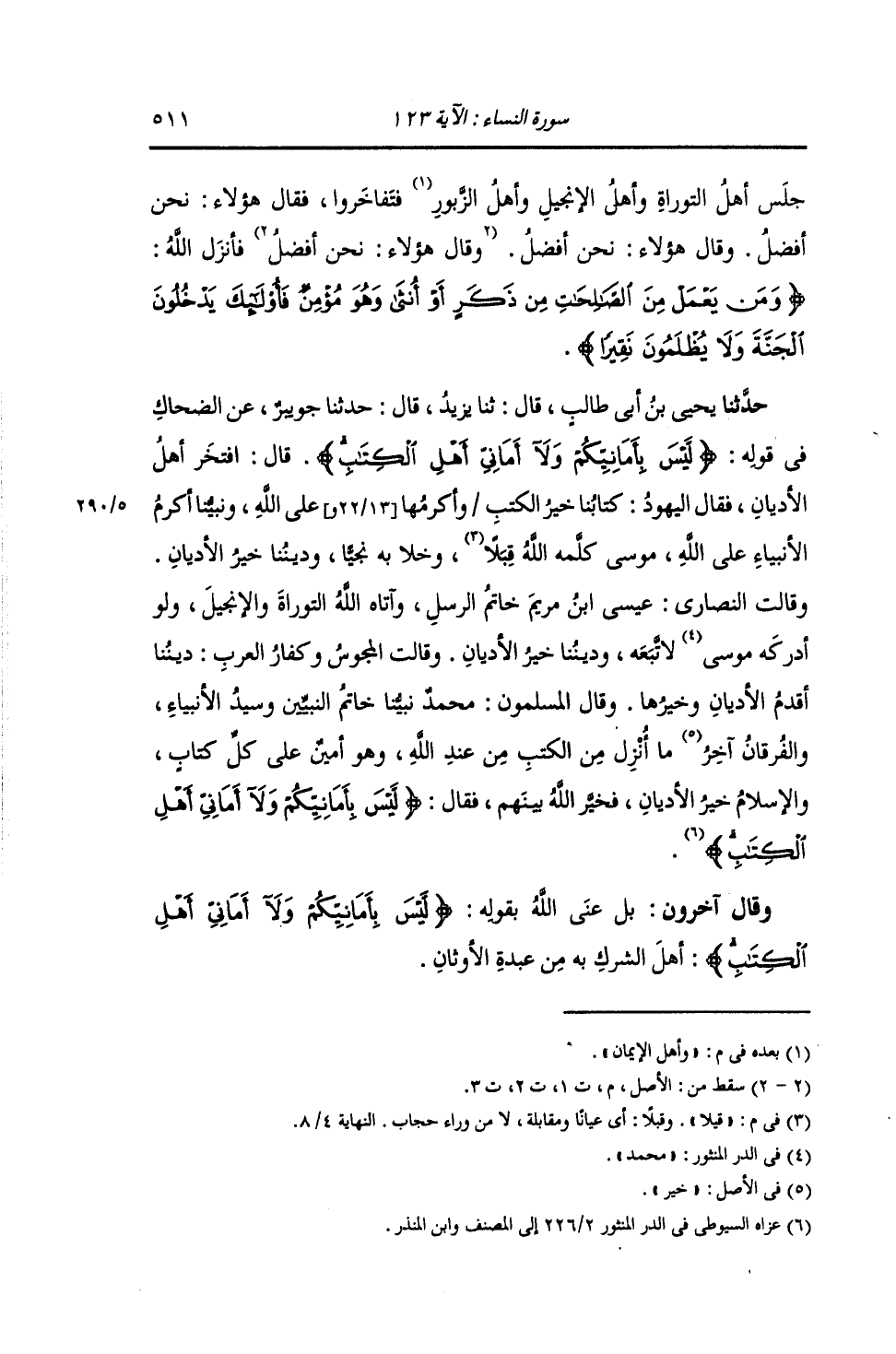 حَدَّثَنَا يَحْيَى بْنُ أَبِي طَالِبٍ , قَالَ: ثنا يَزِيدُ , قَالَ: أَخْبَرَنَا جُوَيْبِرٌ , عَنِ الضَّحَّاكِ , فِي قَوْلِهِ: {§لَيْسَ بِأَمَانِيِّكُمْ وَلَا أَمَانِيِّ أَهْلِ الْكِتَابِ} [النساء: 123] قَالَ: " افْتَخَرَ أَهْلُ الْأَدْيَانِ , فَقَالَتِ الْيَهُودُ: كِتَابُنَا خَيْرُ الْكُتُبِ وَأَكْرَمُهَا عَلَى اللَّهِ , وَنَبِيُّنَا أَكْرَمُ الْأَنْبِيَاءِ عَلَى اللَّهِ مُوسَى , كَلَّمَهُ اللَّهُ قُبُلًا , وَخَلَا بِهِ نَجِيًّا , وَدِينُنَا خَيْرُ الْأَدْيَانِ. وَقَالَتِ النَّصَارَى: عِيسَى ابْنُ مَرْيَمَ خَاتَمُ الرُّسُلِ , وَآتَاهُ اللَّهُ التَّوْرَاةَ وَالْإِنْجِيلَ , وَلَوْ أَدْرَكَهُ مُوسَى لَاتَّبَعَهُ , وَدِينُنَا خَيْرُ الْأَدْيَانِ. وَقَالَتِ الْمَجُوسُ وَكُفَّارُ الْعَرَبِ: دِينُنَا أَقْدَمُ الْأَدْيَانِ وَخَيْرُهَا. وَقَالَ الْمُسْلِمُونَ: مُحَمَّدٌ نَبِيُّنَا خَاتَمُ النَّبِيِّينَ , وَسَيِّدُ الْأَنْبِيَاءِ , وَالْفُرْقَانُ آخِرُ مَا أُنْزِلَ مِنَ الْكُتُبِ مِنْ عِنْدِ اللَّهِ , وَهُوَ أَمِينٌ عَلَى كُلِّ كِتَابٍ , وَالْإِسْلَامُ خَيْرُ الْأَدْيَانِ. فخَيَّرَ اللَّهُ بَيْنَهُمْ , فَقَالَ: {لَيْسَ بِأَمَانِيِّكُمْ وَلَا أَمَانِيِّ أَهْلِ الْكِتَابِ} [النساء: 123] " وَقَالَ آخَرُونَ: بَلْ عَنَى اللَّهُ بِقَوْلِهِ: {لَيْسَ بِأَمَانِيِّكُمْ وَلَا أَمَانِيِّ أَهْلِ الْكِتَابِ} [النساء: 123] أَهْلَ الشِّرْكِ بِهِ مِنْ عَبْدَةِ الْأَوْثَانِ