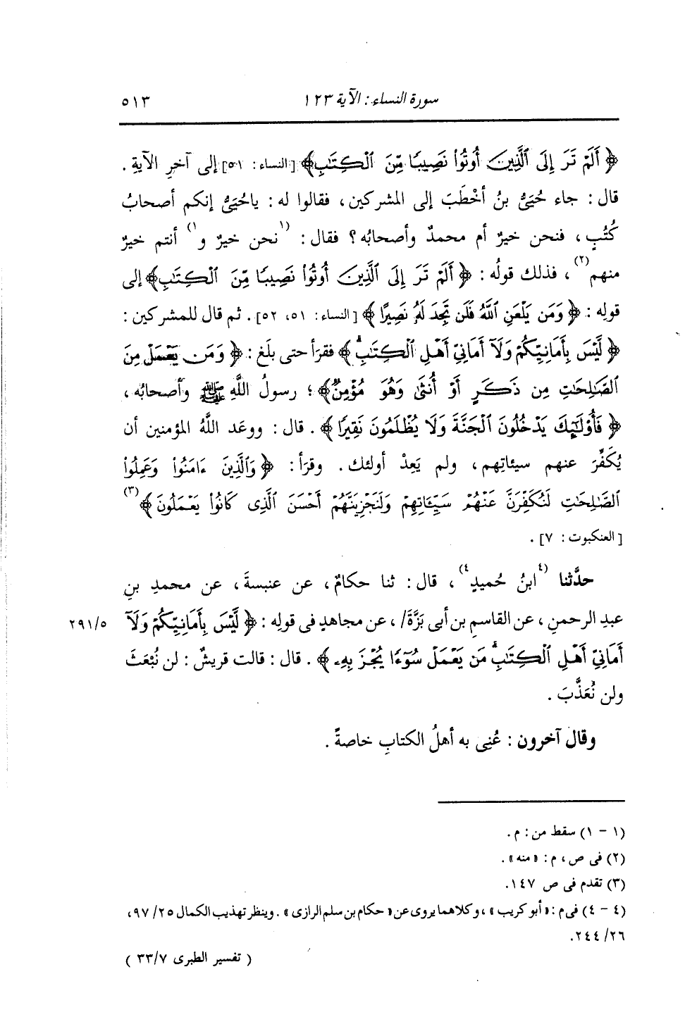 حَدَّثَنَا أَبُو كُرَيْبٍ , قَالَ: ثنا حَكَّامٌ , عَنْ عَنبَسَةَ , عنْ مُحَمَّدِ بْنِ عَبْدِ الرَّحْمَنِ , عَنِ الْقَاسِمِ بْنِ أَبِي بَزَّةَ , عَنْ مُجَاهِدٍ , فِي قَوْلِهِ: {§لَيْسَ بِأَمَانِيِّكُمْ وَلَا أَمَانِيِّ أَهْلِ الْكِتَابِ مَنْ يَعْمَلْ سُوءًا يُجْزَ} [النساء: 123] بِهِ قَالَ: " قَالَتْ قُرَيْشٌ: لَنْ نُبْعَثَ وَلَنْ نُعَذَّبَ " وَقَالَ آخَرُونَ: عُنِيَ بِهِ أَهْلُ الْكِتَابِ خَاصَّةً