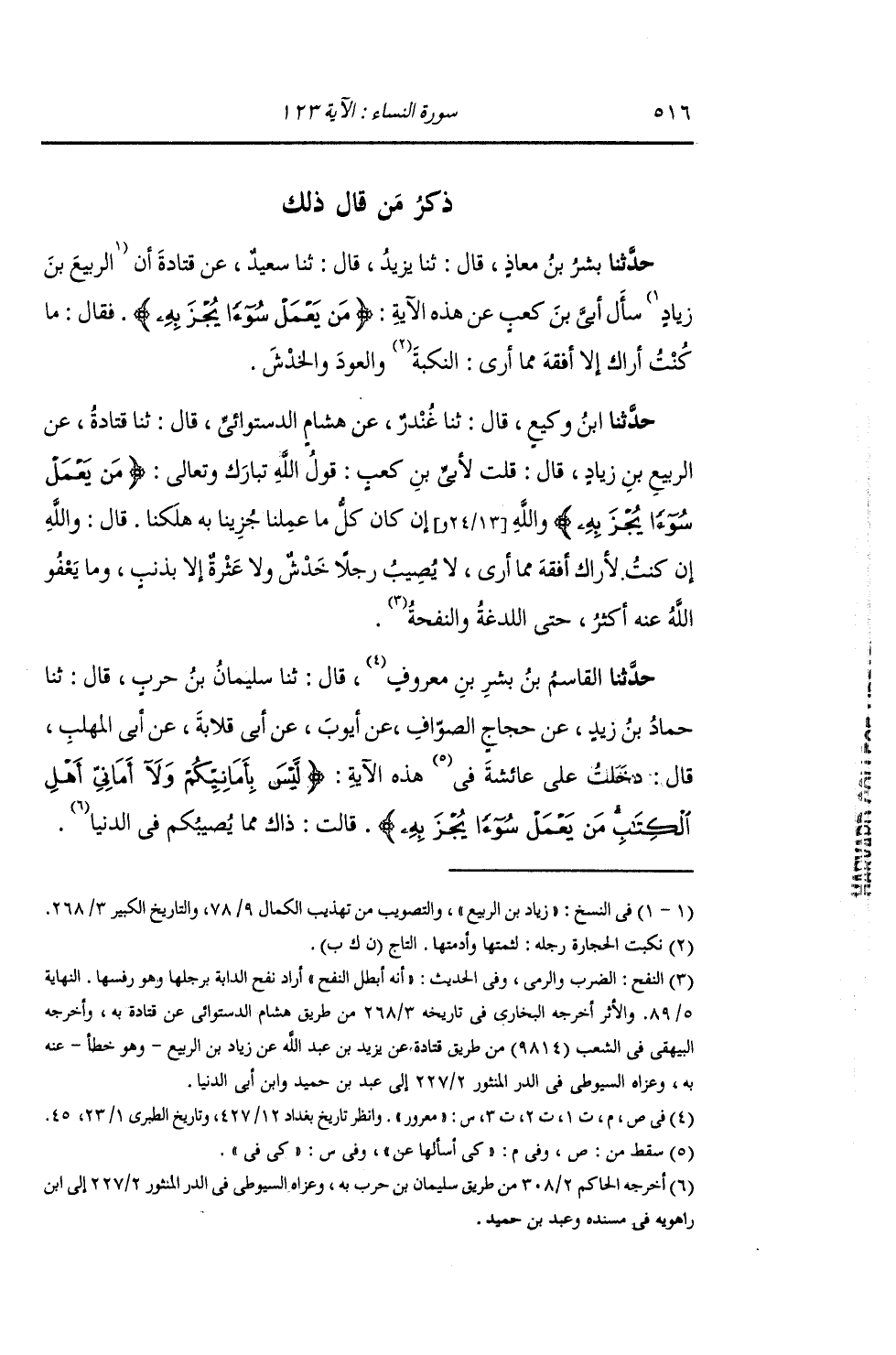 ذِكْرُ مَنْ قَالَ ذَلِكَ: حَدَّثَنَا بِشْرُ بْنُ مُعَاذٍ , قَالَ: ثنا يَزِيدُ , قَالَ: ثنا سَعِيدٌ , عَنْ قَتَادَةَ: أَنَّ زِيَادَ بْنَ الرَّبِيعِ , سَأَلَ أُبَيَّ بْنَ كَعْبٍ عَنْ هَذِهِ الْآيَةِ: {§مَنْ يَعْمَلْ سُوءًا يُجْزَ بِهِ} [النساء: 123] فَقَالَ: مَا كُنْتُ أَرَاكَ إِلَّا أَفْقَهَ مِمَّا أَرَى. النَّكْبَةُ وَالْعَوْدُ وَالْخَدْشُ "
