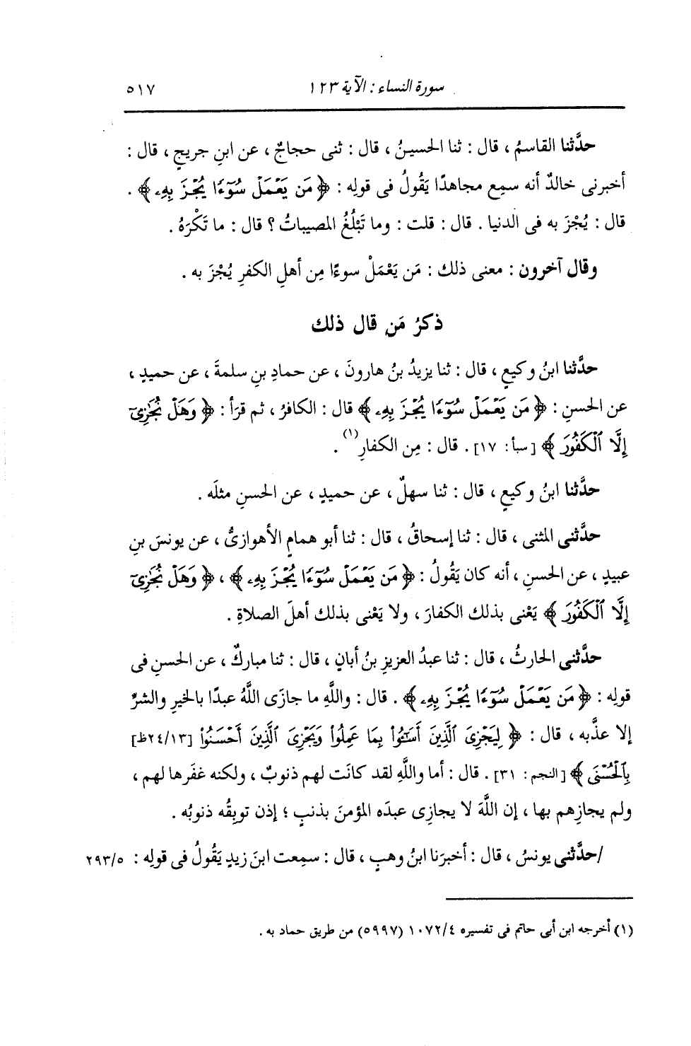 ذِكْرُ مَنْ قَالَ ذَلِكَ: حَدَّثَنَا ابْنُ وَكِيعٍ , قَالَ: ثنا يَزِيدُ بْنُ هَارُونَ , عَنْ حَمَّادِ بْنِ سَلَمَةَ , عَنْ حُمَيْدٍ , عَنِ الْحَسَنِ: {§مَنْ يَعْمَلْ سُوءًا يُجْزَ بِهِ} [النساء: 123] قَالَ: " الْكَافِرُ. ثُمَّ قَرَأَ: {وَهَلْ نُجَازِي إِلَّا الْكُفُورَ} [سبأ: 17] قَالَ: «مِنَ الْكُفَّارِ» حَدَّثَنَا ابْنُ وَكِيعٍ , قَالَ: ثنا سَهْلٌ , عَنْ حُمَيْدٍ , عَنِ الْحَسَنِ , مِثْلَهُ