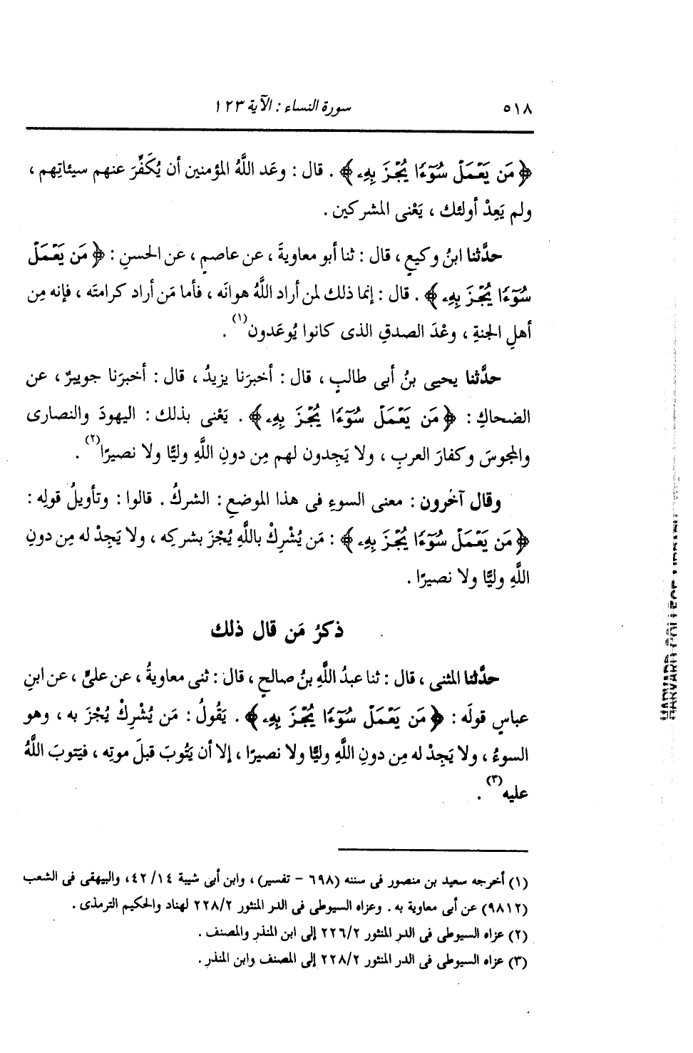 ذِكْرُ مَنْ قَالَ ذَلِكَ: حَدَّثَنِي الْمُثَنَّى , قَالَ: ثنا عَبْدُ اللَّهِ بْنُ صَالِحٍ , قَالَ: ثني مُعَاوِيَةُ , عَنْ عَلِيٍّ , عَنِ ابْنِ عَبَّاسٍ , قَوْلُهُ: {§مَنْ يَعْمَلْ سُوءًا يُجْزَ بِهِ} [النساء: 123] يَقُولُ: " مَنْ يُشْرِكْ يُجْزَ بِهِ , وَهُوَ السُّوءُ {وَلَا يَجِدْ لَهُ مِنْ دُونِ اللَّهِ وَلِيًّا وَلَا نَصِيرًا} [النساء: 123] إِلَّا أَنْ يَتُوبَ قَبْلَ مَوْتِهِ , فَيَتُوبَ اللَّهُ عَلَيْهِ