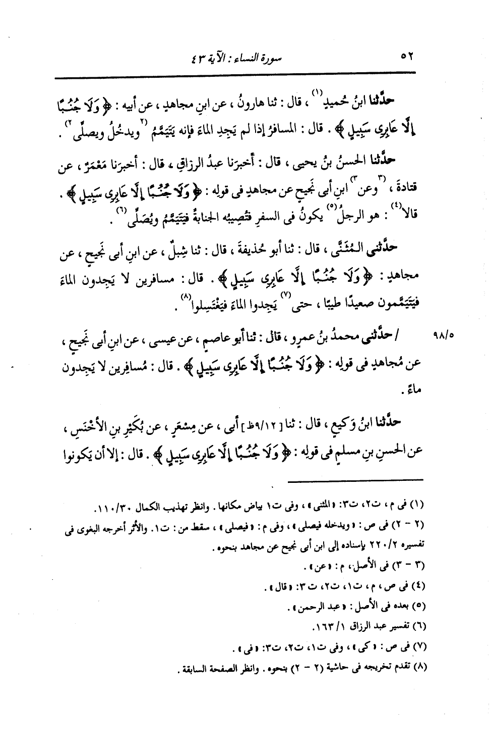 حَدَّثَنَا الْحَسَنُ بْنُ يَحْيَى قَالَ: أَخْبَرَنَا عَبْدُ الرَّزَّاقِ قَالَ: أَخْبَرَنَا مَعْمَرٌ , عَنْ قَتَادَةَ , عَنِ ابْنِ أَبِي نَجِيحٍ عَنْ مُجَاهِدٍ , فِي قَوْلِهِ: {§وَلَا جُنُبًا إِلَّا عَابِرِي سَبِيلٍ} [النساء: 43] قَالَ: «هُوَ الرَّجُلُ يَكُونُ فِي السَّفَرِ فَتُصِيبُهُ الْجَنَابَةُ فَيَتَيَمَّمُ وَيُصَلِّي»