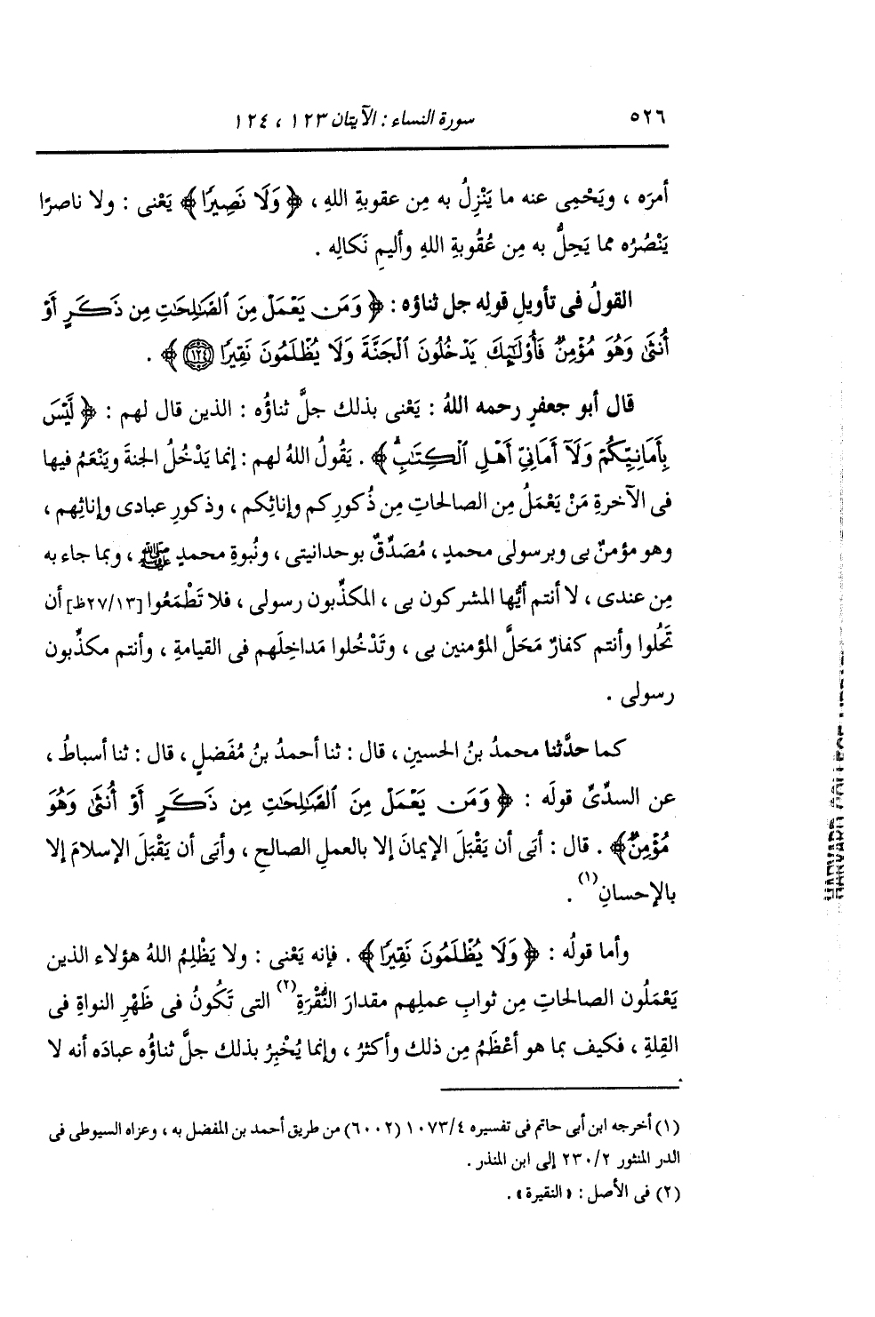 حَدَّثَنَا مُحَمَّدُ بْنُ الْحُسَيْنِ , قَالَ: ثنا أَحْمَدُ بْنُ مُفَضَّلٍ , قَالَ: ثنا أَسْبَاطٌ , عَنِ السُّدِّيِّ قَوْلَهُ: {§وَمَنْ يَعْمَلْ مِنَ الصَّالِحَاتِ مِنْ ذَكَرٍ أَوْ أُنْثَى وَهُوَ مُؤْمِنٌ} [النساء: 124] قَالَ: «أَبَى أَنْ يَقْبَلَ الْإِيمَانَ إِلَّا بِالْعَمَلِ الصَّالِحِ , وَأَبَى أَنْ يَقْبَلَ الْإِسْلَامَ إِلَّا بِالْإِحْسَانِ.» وَأَمَّا قَوْلُهُ: {وَلَا يُظْلَمُونَ نَقِيرًا} [النساء: 124] فَإِنَّهُ يَعْنِي: وَلَا يَظْلِمُ اللَّهُ هَؤُلَاءِ الَّذِينَ يَعْمَلُونَ الصَّالِحَاتِ مِنْ ثَوَابِ عَمَلِهِمْ مِقْدَارَ النُّقْرَةِ الَّتِي تَكُونُ فِي ظَهْرِ النَّوَاةِ فِي الْقِلَّةِ , فَيَكُفَّ بِمَا هُوَ أَعْظَمُ مِنْ ذَلِكَ وَأَكْثَرُ. وَإِنَّمَا يُخْبِرُ بِذَلِكَ جَلَّ ثَنَاؤُهُ عِبَادَهُ أَنَّهُ لَا -[527]- يَبْخَسُهُمْ مِنْ جَزَاءِ أَعْمَالِهِمْ قَلِيلًا وَلَا كَثِيرًا , وَلَكِنْ يُوَفِّيهِمْ ذَلِكَ كَمَا وَعَدَهُمْ. وَبِالَّذِي قُلْنَا فِي مَعْنَى النَّقِيرِ قَالَ أَهْلُ التَّأْوِيلِ