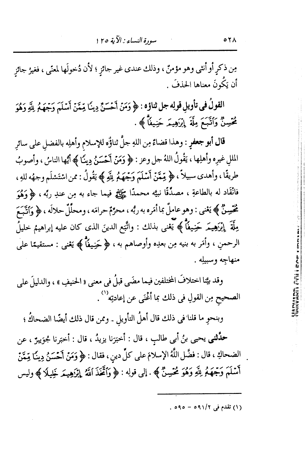 §الْقَوْلُ فِي تَأْوِيلِ قَوْلِهِ تَعَالَى: {وَمَنْ أَحْسَنُ دِينًا مِمَّنْ أَسْلَمَ وَجْهَهُ لِلَّهِ وَهُوَ مُحْسِنٌ} [النساء: 125] وَاتَّبَعَ مِلَّةَ إِبْرَاهِيمَ حَنِيفًا وَاتَّخَذَ اللهُ إِبْرَاهِيمَ خَلِيلاً وَهَذَا قَضَاءٌ مِنَ اللَّهِ جَلَّ ثَنَاؤُهُ لِلْإِسْلَامِ وَأَهْلِهِ بِالْفَضْلِ عَلَى سَائِرِ الْمِلَلِ غَيْرِهِ وَأَهْلِهَا , يَقُولُ اللَّهُ: {وَمَنْ أَحْسَنُ دِينًا} [النساء: 125] أَيُّهَا النَّاسُ , وَأَصْوَبَ طَرِيقًا وَأَهْدَى سَبِيلًا {مِمَّنْ أَسْلَمَ وَجْهَهُ لِلَّهِ} [النساء: 125] يَقُولُ: " مِمَّنِ اسْتَسْلَمَ وَجْهُهُ لِلَّهِ , فَانْقَادَ لَهُ بِالطَّاعَةِ , مُصَدِّقًا نَبِيَّهُ مُحَمَّدًا صَلَّى اللهُ عَلَيْهِ وَسَلَّمَ فِيمَا جَاءَ بِهِ مِنْ عِنْدِ رَبِّهِ. {وَهُوَ مُحْسِنٌ} [البقرة: 112] يَعْنِي: وَهُوَ عَامِلٌ بِمَا أَمَرَهُ بِهِ رَبُّهُ , مُحَرِّمٌ حَرَامَهُ , وَمُحَلِّلٌ حَلَالَهُ. {وَاتَّبَعَ مِلَّةَ إِبْرَاهِيمَ حَنِيفًا} [النساء: 125] يَعْنِي بِذَلِكَ: وَاتَّبِعِ الدِّينَ الَّذِي كَانَ عَلَيْهِ إِبْرَاهِيمُ خَلِيلُ الرَّحْمَنِ، وَأَمَرَ بِهِ بَنِيهِ مِنْ بَعْدِهِ وَأَوْصَاهُمْ بِهِ، حَنِيفًا يَعْنِي: مُسْتَقِيمًا عَلَى مِنْهَاجِهِ وَسَبِيلِهِ. وَقَدْ بَيَّنَّا اخْتِلَافَ الْمُخْتَلِفِينَ فِيمَا مَضَى قَبْلُ فِي مَعْنَى الْحَنِيفِ وَالدَّلِيلَ عَلَى الصَّحِيحِ مِنَ الْقَوْلِ فِي ذَلِكَ بِمَا أَغْنَى عَنْ إِعَادَتِهِ، وَبِنَحْوِ مَا قُلْنَا فِي ذَلِكَ قَالَ أَهْلُ التَّأْوِيلِ. وَمِمَّنْ قَالَ ذَلِكَ أَيْضًا الضَّحَّاكُ