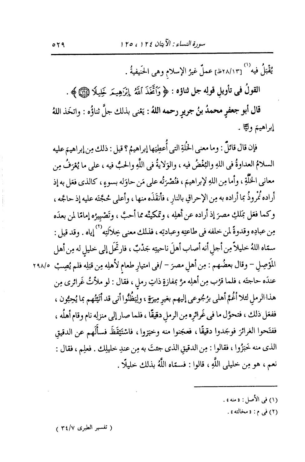 §الْقَوْلُ فِي تَأْوِيلِ قَوْلِهِ تَعَالَى: {وَاتَّخَذَ اللَّهُ إِبْرَاهِيمَ خَلِيلًا} [النساء: 125] يَعْنِي بِذَلِكَ جَلَّ ثَنَاؤُهُ: وَاتَّخَذَ اللَّهُ إِبْرَاهِيمَ وَلِيًّا. فَإِنْ قَالَ قَائِلٌ: وَمَا مَعْنَى الْخَلَّةُ الَّتِي أُعْطِيَهَا إِبْرَاهِيمُ؟ قِيلَ: ذَلِكَ مِنْ إِبْرَاهِيمَ عَلَيْهِ السَّلَامُ الْعَدَاوَةُ فِي اللَّهِ وَالْبُغْضُ فِيهِ , وَالْوَلَايَةُ فِي اللَّهِ وَالْحُبُّ فِيهِ , عَلَى مَا يُعْرَفُ مِنْ مَعَانِي الْخَلَّةِ. وَأَمَّا مِنَ اللَّهِ لِإِبْرَاهِيمَ , فَنُصْرَتُهُ عَلَى مَنْ حَاوَلَهُ بِسُوءٍ , كَالَّذِي فَعَلَ بِهِ إِذْ أَرَادَهُ نَمْرُوذُ بِمَا أَرَادَهُ بِهِ مِنَ الْإِحْرَاقِ بِالنَّارِ , فَأَنْقَذَهُ مِنْهَا , وَأَعْلَى حَجَّتَهُ عَلَيْهِ إِذْ حَاجَّهُ , وَكَمَا فَعَلَ مَلِكُ مِصْرَ إِذْ أَرَادَهُ عَنْ أَهْلِهِ , وَتَمْكِينُهُ مِمَّا أَحَبَّ , وَتَصْيِيرُهُ إِمَامًا لِمَنْ بَعْدَهُ مِنْ عِبَادِهِ وَقُدْوَةً لِمَنْ خَلَقَهُ فِي طَاعَتِهِ وَعِبَادَتِهِ , فَذَلِكَ مَعْنَى مُخَالَّتِهِ إِيَّاهُ. وَقَدْ قِيلَ: سَمَّاهُ اللَّهُ خَلِيلًا مِنْ أَجْلِ أَنَّهُ أَصَابَ أَهْلَ نَاحِيَتِهِ جَدْبٌ , فَارْتَحَلَ إِلَى خَلِيلٍ لَهُ مِنْ أَهْلِ الْمَوْصِلِ , وَقَالَ بَعْضُهُمْ: مِنْ أَهْلِ مِصْرَ , فِي امْتِيَارِ طَعَامٍ لِأَهْلِهِ مِنْ قِبَلِهِ فَلَمْ يُصِبْ عِنْدَهُ حَاجَتَهُ , فَلَمَّا قَرُبَ مِنْ أَهْلِهِ مَرَّ بِمَفَازَةٍ ذَاتِ رَمْلٍ , فَقَالَ: لَوْ مَلَأْتُ غَرَائِرِي مِنْ هَذَا الرَّمْلِ لِئَلَّا أَغُمَّ أَهْلِي بِرُجُوعِي إِلَيْهِمْ بِغَيْرِ مِيرَةٍ , وَلِيَظُنُّوا أَنِّي قَدْ أَتَيْتُهُمْ بِمَا يُحِبُّونَ. ففَعَلَ ذَلِكَ , فَتَحَوَّلَ مَا فِي غَرَائِرِهِ مِنَ الرَّمْلِ دَقِيقًا , فَلَمَّا صَارَ إِلَى مَنْزِلِهِ نَامَ وَقَامَ أَهْلُهُ , فَفَتَحُوا الْغَرَائِرَ فَوَجَدُوا دَقِيقًا , فَعَجَنُوا مِنْهُ وَخَبَزُوا , فَاسْتَيْقَظَ فَسَأَلَهُمْ عَنِ الدَّقِيقِ الَّذِي مِنْهُ خَبَزُوا , فَقَالُوا: مِنَ الدَّقِيقِ الَّذِي جِئْتَ بِهِ مِنْ عِنْدِ خَلِيلِكَ , فَعَلِمَ , فَقَالَ: نَعَمْ هُوَ مِنْ خَلِيلِي اللَّهِ. قَالُوا: فَسَمَّاهُ اللَّهُ بِذَلِكَ خَلِيلًا