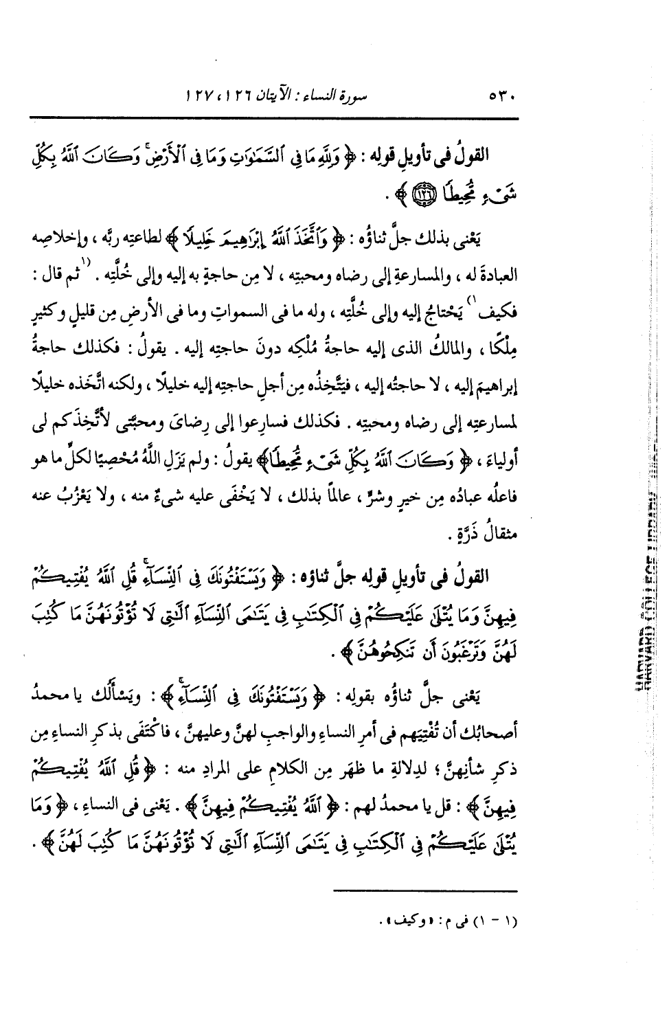 §الْقَوْلُ فِي تَأْوِيلِ قَوْلِهِ تَعَالَى: {وَلِلَّهِ مَا فِي السَّمَوَاتِ وَمَا فِي الْأَرْضِ وَكَانَ اللَّهُ بِكُلِّ شَيْءٍ مُحِيطًا} يَعْنِي بِذَلِكَ جَلَّ ثَنَاؤُهُ: وَاتَّخَذَ اللَّهُ إِبْرَاهِيمَ خَلِيلًا لِطَاعَتِهِ رَبَّهُ , وَإِخْلَاصِهِ الْعِبَادَةَ لَهُ , وَالْمُسَارَعَةِ إِلَى رِضَاهُ وَمَحَبَّتِهِ , لَا مِنْ حَاجَةٍ بِهِ إِلَيْهِ وَإِلَى خُلَّتِهِ , وَكَيْفَ يَحْتَاجُ إِلَيْهِ وَإِلَى خُلَّتِهِ , وَلَهُ مَا فِي السَّمَوَاتِ وَمَا فِي الْأَرْضِ مِنْ قَلِيلٍ وَكَثِيرٍ مُلْكًا , وَالْمَالِكُ الَّذِي إِلَيْهِ حَاجَةٌ مُلْكِهِ دُونَ حَاجَتِهِ إِلَيْهِ , فَكَذَلِكَ حَاجَةُ إِبْرَاهِيمَ إِلَيْهِ , لَا حَاجَتُهُ إِلَيْهِ , فَيَتَّخِذُهُ مِنْ أَجْلِ حَاجَتِهِ إِلَيْهِ خَلِيلًا , وَلَكِنَّهُ اتَّخَذَهُ خَلِيلًا لِمُسَارَعَتِهِ إِلَى رِضَاهُ وَمَحَبَّتِهِ. يَقُولُ: فَكَذَلِكَ فَسَارِعُوا إِلَى رِضَايَ وَمَحَبَّتِي لَاتَّخِذَكُمْ لِي أَوْلِيَاءَ. {وَكَانَ اللَّهُ بِكُلِّ شَيْءٍ مُحِيطًا} [النساء: 126] وَلَمْ يَزَلِ اللَّهُ مُحِصِيًا لِكُلِّ مَا هُوَ فَاعِلُهُ عِبَادُهُ مِنْ خَيْرٍ وَشَرٍّ , عَالِمًا بِذَلِكَ , لَا يَخْفَى عَلَيْهِ شَيْءٌ مِنْهُ , وَلَا يَعْزُبُ عَنْهُ مِثْقَالَ ذَرَّةٍ