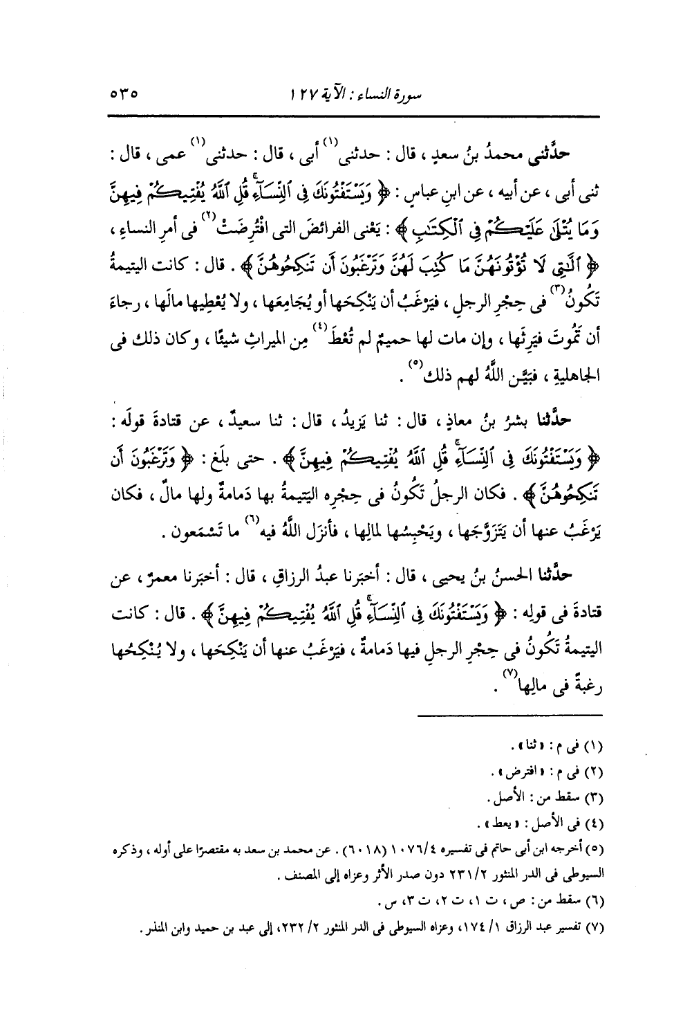 حَدَّثَنِي مُحَمَّدُ بْنُ سَعْدٍ , قَالَ: ثنا أَبِي قَالَ: ثنا عَمِّي , قَالَ: ثني أَبِي عَنْ أَبِيهِ , عَنِ ابْنِ عَبَّاسٍ: {§وَيَسْتَفْتُونَكَ فِي النِّسَاءِ قُلِ اللَّهُ يُفْتِيكُمْ فِيهِنَّ وَمَا يُتْلَى عَلَيْكُمْ فِي الْكِتَابِ} [النساء: 127] يَعْنِي الْفَرَائِضَ الَّتِي افْتَرَضَ فِي أَمْرِ النِّسَاءِ اللَّاتِي لَا تُؤْتُونَهُنَّ مَا كُتِبَ لَهُنَّ {وَتَرْغَبُونَ أَنْ تَنْكِحُوهُنَّ} [النساء: 127] قَالَ: «كَانَتِ الْيَتِيمَةُ تَكُونُ فِي حِجْرِ الرَّجُلِ , فَيَرْغَبُ أَنْ يَنْكِحَهَا , أَوْ يُجَامِعَهَا وَلَا يُعْطِيَهَا مَالَهَا , رَجَاءَ أَنْ تَمُوتَ فَيَرِثَهَا , وَإِنْ مَاتَ لَهَا حَمِيمٌ لَمْ تُعْطَ مِنَ الْمِيرَاثِ شَيْئًا , وَكَانَ ذَلِكَ فِي الْجَاهِلِيَّةِ , فَبَيَّنَ اللَّهُ لَهُمْ ذَلِكَ»
