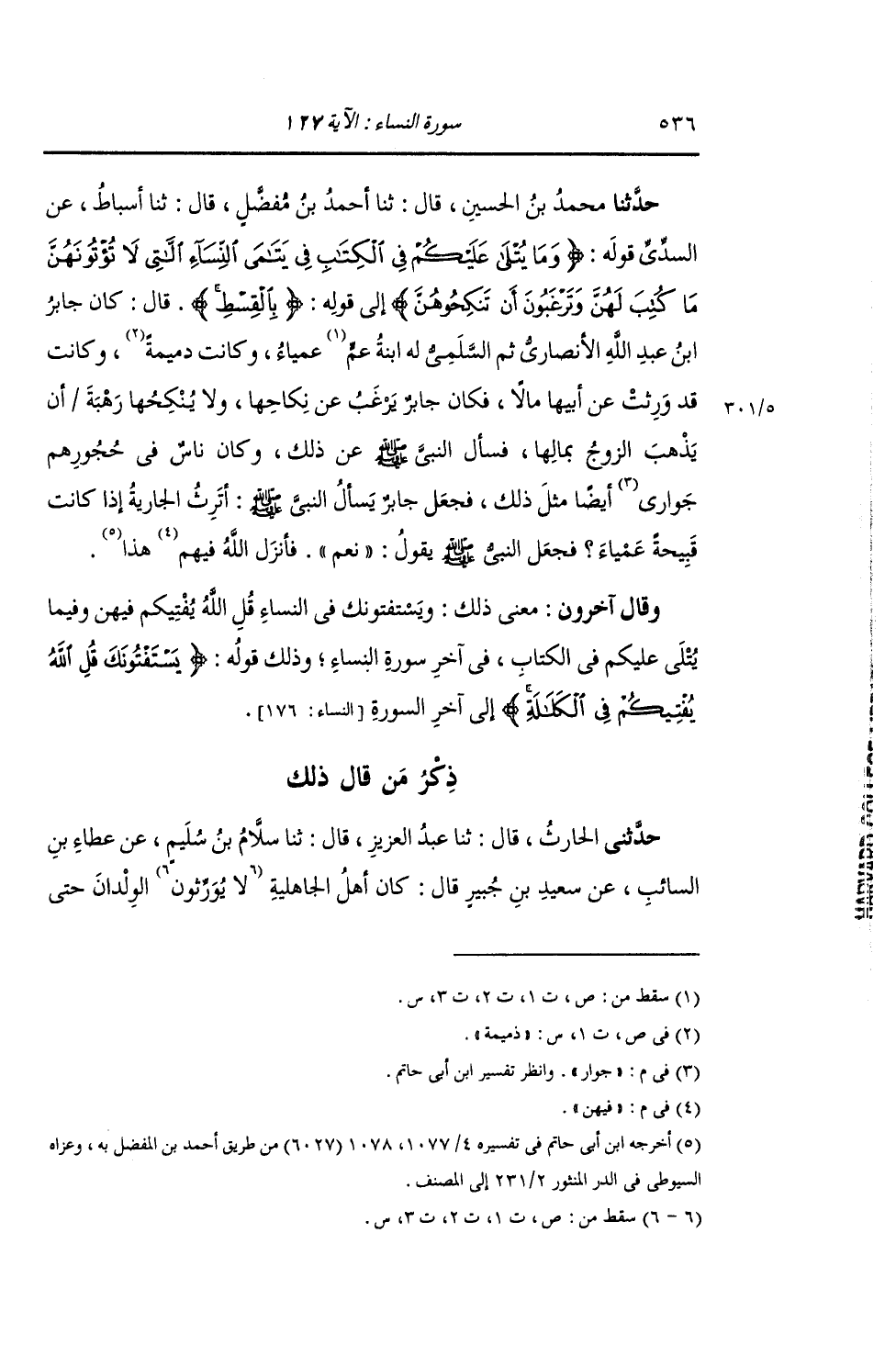 ذِكْرُ مَنْ قَالَ ذَلِكَ: حَدَّثَنِي الْحَارِثُ , قَالَ: ثنا عَبْدُ الْعَزِيزِ , قَالَ: ثنا سَلَّامُ بْنُ سُلَيْمٍ , عَنْ عَطَاءِ بْنِ السَّائِبِ , عَنْ سَعِيدِ بْنِ جُبَيْرٍ , قَالَ: كَانَ أَهْلُ الْجَاهِلِيَّةِ لَا يُوَرِّثُونَ الْوِلْدَانَ حَتَّى -[537]- يَحْتَلِمُوا , فَأَنْزَلَ اللَّهُ: {§وَيَسْتَفْتُونَكَ فِي النِّسَاءِ} [النساء: 127] إِلَى قَوْلِهِ: {فَإِنَّ اللَّهَ كَانَ بِهِ عَلِيمًا} [النساء: 127] قَالَ: " وَنَزَلَتْ هَذِهِ الْآيَةُ: {إِنِ امْرُؤٌ هَلَكَ لَيْسَ لَهُ وَلَدٌ} [النساء: 176] الْآيَةَ كُلَّهَا وَقَالَ آخَرُونَ: بَلْ مَعْنَى ذَلِكَ: وَيَسْتَفْتُونَكَ فِي النِّسَاءِ , قُلِ اللَّهُ يُفْتِيكُمْ فِيهِنَّ وَفِيمَا يُتْلَى عَلَيْكُمْ فِي الْكِتَابِ , يَعْنِي فِي أَوَّلِ هَذِهِ السُّورَةِ , وَذَلِكَ قَوْلُهُ: {وَإِنْ خِفْتُمْ أَلَا تُقْسِطُوا فِي الْيَتَامَى فَانْكِحُوا مَا طَابَ لَكُمْ مِنَ النِّسَاءِ} [النساء: 3]