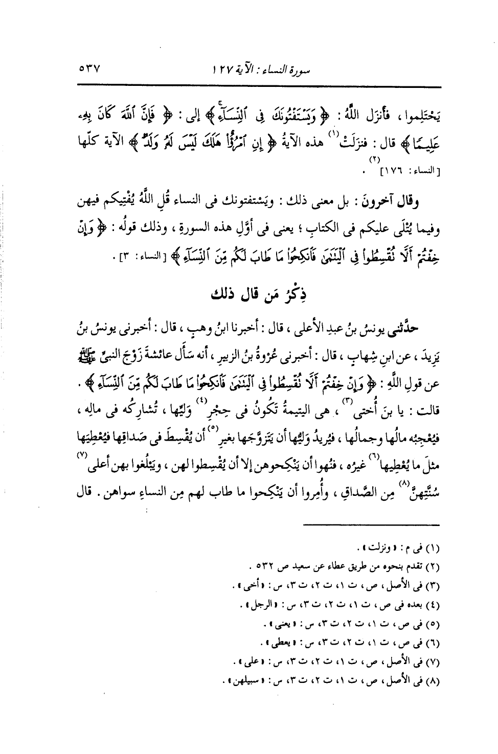 ذِكْرُ مَنْ قَالَ ذَلِكَ: حَدَّثَنِي يُونُسُ بْنُ عَبْدِ الْأَعْلَى , قَالَ: أَخْبَرَنَا ابْنُ وَهْبٍ , قَالَ: أَخْبَرَنِي يُونُسُ بْنُ يَزِيدَ , عَنِ ابْنِ شِهَابٍ , قَالَ: أَخْبَرَنِي عُرْوَةُ بْنُ الزُّبَيْرِ , أَنَّهُ سَأَلَ عَائِشَةَ زَوْجَ النَّبِيِّ صَلَّى اللهُ عَلَيْهِ وَسَلَّمَ , عَنْ قَوْلِ اللَّهِ: {§وَإِنْ خِفْتُمْ أَلَا تُقْسِطُوا فِي الْيَتَامَى فَانْكِحُوا مَا طَابَ لَكُمْ مِنَ النِّسَاءِ} [النساء: 3] قَالَتْ: يَا ابْنَ أُخْتِي , هِيَ الْيَتِيمَةُ تَكُونُ فِي حِجْرِ وَلِيِّهَا , تُشَارِكُهُ فِي مَالِهِ , فَيُعْجِبُهُ مَالُهَا وَجَمَالُهَا , فَيُرِيدُ وَلِيُّهَا أَنْ يَتَزَوَّجَهَا بِغَيْرِ أَنْ يُقْسِطَ فِي صَدَاقِهَا , فَيُعْطِيَهَا مِثْلَ مَا يُعْطِيَهَا غَيْرُهُ , فَنُهُوا أَنْ يَنْكِحُوهُنَّ إِلَّا أَنْ يُقْسِطُوا لَهُنَّ وَيَبْلُغُوا بِهِنَّ أَعْلَى سُنَّتِهِنَّ مِنَ الصَّدَاقِ , وَأُمِرُوا أَنْ يَنْكِحُوا مَا طَابَ لَهُمْ مِنَ النِّسَاءِ سِوَاهُنَّ. قَالَ -[538]- عُرْوَةُ: قَالَتْ عَائِشَةُ: ثُمَّ إِنَّ النَّاسَ اسْتَفْتَوْا رَسُولَ اللَّهِ صَلَّى اللهُ عَلَيْهِ وَسَلَّمَ بَعْدَ هَذِهِ الْآيَةِ فِيهِنَّ , فَأَنْزَلَ اللَّهُ: {وَيَسْتَفْتُونَكَ فِي النِّسَاءِ قُلِ اللَّهُ يُفْتِيكُمْ فِيهِنَّ وَمَا يُتْلَى عَلَيْكُمْ فِي الْكِتَابِ فِي يَتَامَى النِّسَاءِ اللَّاتِي لَا تُؤْتُونَهُنَّ مَا كُتِبَ لَهُنَّ وَتَرْغَبُونَ أَنْ تَنْكِحُوهُنَّ} [النساء: 127] قَالَتْ: وَالَّذِي ذَكَرَ اللَّهُ أَنَّهُ يُتْلَى فِي الْكِتَابِ الْآيَةُ الْأُولَى الَّتِي قَالَ فِيهَا: {وَإِنْ خِفْتُمْ أَلَا تُقْسِطُوا فِي الْيَتَامَى فَانْكِحُوا مَا طَابَ لَكُمْ مِنَ النِّسَاءِ} [النساء: 3] " حَدَّثَنِي الْمُثَنَّى , قَالَ: ثنا أَبُو صَالِحٍ , قَالَ: ثني اللَّيْثُ , قَالَ: ثني يُونُسُ , عَنِ ابْنِ شِهَابٍ , عَنْ عُرْوَةَ , عَنْ عَائِشَةَ , مِثْلَهُ. فَعَلَى هَذِهِ الْأَقْوَالِ الثَّلَاثَةِ الَّتِي ذَكَرْنَاهَا مَا الَّتِي فِي قَوْلِهِ: {وَمَا يُتْلَى عَلَيْكُمْ} [النساء: 127] فِي مَوْضِعِ خَفْضٍ بِمَعْنَى الْعَطْفِ عَلَى الْهَاءِ وَالنُّونِ الَّتِي فِي قَوْلِهِ: {يُفْتِيكُمْ فِيهِنَّ} [النساء: 127] فَكَأَنَّهُمْ وَجَّهُوا تَأْوِيلَ الْآيَةِ: قُلِ اللَّهُ يُفْتِيكُمْ أَيُّهَا النَّاسُ فِي النِّسَاءِ , وَفِيمَا يُتْلَى عَلَيْكُمْ فِي الْكِتَابِ , وَقَالَ آخَرُونَ: نَزَلَتْ هَذِهِ الْآيَةُ عَلَى رَسُولِ اللَّهِ صَلَّى اللهُ عَلَيْهِ وَسَلَّمَ فِي قَوْمٍ مِنْ أَصْحَابِهِ سَأَلُوهُ عَنْ أَشْيَاءَ مِنْ أَمْرِ النِّسَاءِ , وَتَرَكُوا الْمَسْأَلَةَ عَنْ أَشْيَاءَ أُخَرَ كَانُوا يَفْعَلُونَهَا , فَأَفْتَاهُمُ اللَّهُ فِيمَا سَأَلُوا عَنْهُ وَفِيمَا تَرَكُوا الْمَسْأَلَةَ عَنْهُ