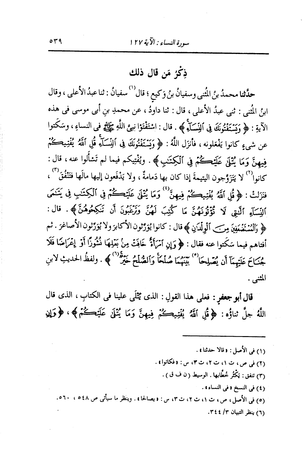 ذِكْرُ مَنْ قَالَ ذَلِكَ: حَدَّثَنَا مُحَمَّدُ بْنُ الْمُثَنَّى , وَسُفْيَانُ بْنُ وَكِيعٍ , قَالَ سُفْيَانُ: ثنا عَبْدُ الْأَعْلَى , وَقَالَ ابْنُ الْمُثَنَّى: ثني عَبْدُ الْأَعْلَى قَالَ: ثنا دَاوُدُ , عَنْ مُحَمَّدِ بْنِ أَبِي مُوسَى , فِي هَذِهِ الْآيَةِ: {§وَيَسْتَفْتُونَكَ فِي النِّسَاءِ} [النساء: 127] قَالَ: " اسْتَفْتَوْا نَبِيَّ اللَّهِ صَلَّى اللهُ عَلَيْهِ وَسَلَّمَ فِي النِّسَاءِ , وَسَكَتُوا عَنْ شَيْءٍ كَانُوا يَفْعَلُونَهُ , فَأَنْزَلَهُ اللَّهُ: {وَيَسْتَفْتُونَكَ فِي النِّسَاءِ قُلِ اللَّهُ يُفْتِيكُمْ فِيهِنَّ وَمَا يُتْلَى عَلَيْكُمْ فِي الْكِتَابِ} [النساء: 127] وَيُفْتِيكُمْ فِيمَا لَمْ تَسْأَلُوا عَنْهُ. قَالَ: كَانُوا لَا يَتَزَوَّجُونَ الْيَتِيمَةَ إِذَا كَانَ بِهَا دَمَامَةٌ , وَلَا يَدْفَعُونَ إِلَيْهَا مَالَهَا فَتُنْفِقَ , فَنَزَلَتْ: {قُلِ اللَّهُ يُفْتِيكُمْ فِيهِنَّ وَمَا يُتْلَى عَلَيْكُمْ فِي الْكِتَابِ فِي يَتَامَى النِّسَاءِ اللَّاتِي لَا تُؤْتُونَهُنَّ مَا كُتِبَ لَهُنَّ وَتَرْغَبُونَ أَنْ تَنْكِحُوهُنَّ} [النساء: 127] قَالَ: " وَالْمُسْتَضْعَفِينَ مِنَ الْوِلْدَانِ. قَالَ: كَانُوا يُوَرِّثُونَ الْأَكَابِرَ وَلَا يُوَرِّثُونَ الْأَصَاغِرَ , ثُمَّ أَفْتَاهُمْ فِيمَا سَكَتُوا عَنْهُ , فَقَالَ: {وَإِنِ امْرَأَةٌ خَافَتْ مِنْ بَعْلِهَا نُشُوزًا أَوْ إِعْرَاضًا فَلَا جُنَاحَ عَلَيْهِمَا أَنْ يُصْلِحَا بَيْنَهُمَا صُلْحًا وَالصُّلْحُ خَيْرٌ} [النساء: 128] , وَلَفْظُ الْحَدِيثِ لِابْنِ الْمُثَنَّى " قَالَ أَبُو جَعْفَرٍ: فَعَلَى هَذَا الْقَوْلِ الَّذِي يُتْلَى عَلَيْنَا فِي الْكِتَابِ الَّذِي قَالَ اللَّهُ جَلَّ ثَنَاؤُهُ: {قُلِ اللَّهُ يُفْتِيكُمْ فِيهِنَّ وَمَا يُتْلَى عَلَيْكُمْ} [النساء: 127] {وَإِنِ