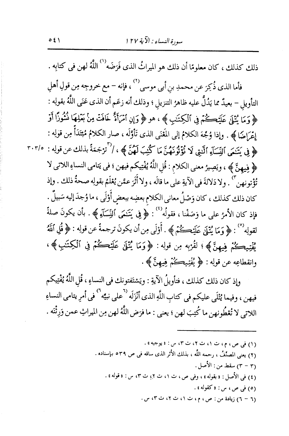 الْأَمْرُ عَلَى مَا وَصَفْنَا , فَقَوْلُهُ: {فِي يَتَامَى النِّسَاءِ} [النساء: 127] بِأَنْ يَكُونَ صِلَةً لِقَوْلِهِ: {وَمَا يُتْلَى عَلَيْكُمْ} [النساء: 127] أَوْلَى مِنْ أَنْ يَكُونَ تَرْجَمَةً عَنْ قَوْلِهِ: {قُلِ اللَّهُ يُفْتِيكُمْ فِيهِنَّ} [النساء: 127] لِقُرْبِهِ مِنْ قَوْلِهِ: {وَمَا يُتْلَى عَلَيْكُمْ فِي الْكِتَابِ} [النساء: 127] , وَانْقِطَاعِهِ عَنْ قَوْلِهِ: {يُفْتِيكُمْ فِيهِنَّ} [النساء: 127] وَإِذْ كَانَ ذَلِكَ كَذَلِكَ , فَتَأْوِيلُ الْآيَةِ: وَيَسْتَفْتُونَكَ فِي النِّسَاءِ , قُلِ اللَّهُ يُفْتِيكُمْ فِيهِنَّ , وَفِيمَا يُتْلَى عَلَيْكُمْ فِي كِتَابِ اللَّهِ الَّذِي أَنْزَلَهُ عَلَى نَبِيِّهِ فِي أَمْرِ يَتَامَى النِّسَاءِ اللَّاتِي لَا تُعْطُونَهُنَّ مَا كُتِبَ لَهُنَّ , يَعْنِي: مَا فَرَضَ اللَّهُ لَهُنَّ مِنَ الْمِيرَاثِ عَمَّنْ وَرِثْنَهُ. -[542]- كَمَا: