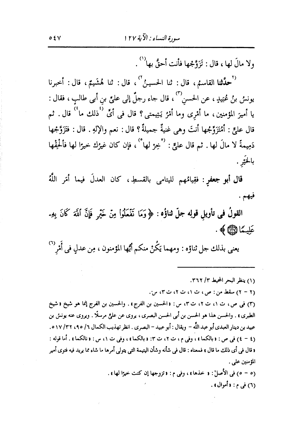 حَدَّثَنَا الْقَاسِمُ , قَالَ: ثنا الْحُسَيْنُ , قَالَ: ثنا هُشَيْمٌ , قَالَ: أَخْبَرَنَا يُونُسُ بْنُ عُبَيْدٍ , عَنِ الْحَسَنِ , قَالَ: جَاءَ رَجُلٌ إِلَى عَلِيِّ بْنِ أَبِي طَالِبٍ , فَقَالَ: يَا أَمِيرَ الْمُؤْمِنِينَ , مَا أَمْرِي , وَمَا أَمْرُ يَتِيمَتِي؟ قَالَ: فِي أَيٍّ بَالُكُمَا؟ قَالَ: ثُمَّ قَالَ عَلِيٌّ: أَمُتَزَوِّجُهَا أَنْتَ غَنِيَّةً جَمِيلَةً؟ قَالَ: نَعَمْ وَالْإِلَهِ. قَالَ: فَتَزَوَّجْهَا دَمِيمَةً لَا مَالَ لَهَا. ثُمَّ قَالَ عَلِيٌّ: «§تَزَوَّجْهَا إِنْ كُنْتَ خَيْرًا لَهَا , فَإِنْ كَانَ غَيْرُكَ خَيْرًا لَهَا فَأَلْحِقْهَا بِالْخَيْرِ» قَالَ أَبُو جَعْفَرٍ: فَقِيَامُهُمْ لِلْيَتَامَى بِالْقِسْطِ كَانَ الْعَدْلَ فِيمَا أَمَرَ اللَّهُ فِيهِمْ