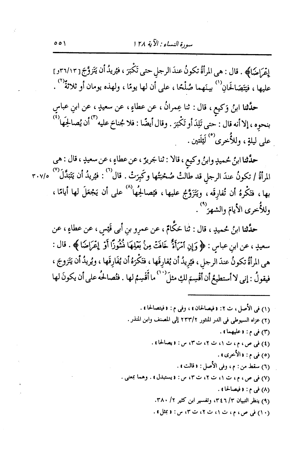 حَدَّثَنَا ابْنُ وَكِيعٍ , وَابْنُ حُمَيْدٍ , قَالَا: ثنا جَرِيرٌ , عَنْ عَطَاءٍ , عَنْ سَعِيدِ بْنِ جُبَيْرٍ , قَالَ: «§هِيَ الْمَرْأَةُ تَكُونُ عِنْدَ الرَّجُلِ قَدْ طَالَتْ صُحْبَتُهَا وَكَبِرَتْ , فَيُرِيدُ أَنْ يَسْتَبْدِلَ بِهَا فَتَكْرَهُ أَنْ تُفَارِقَهُ , فَيَتَزَوَّجُ عَلَيْهَا , فَيَصَّالَحَا عَلَى أَنْ يَجْعَلَ لَهَا أَيَّامًا , وَلِلْأُخْرَى الْأَيَّامَ وَالشَّهْرَ»