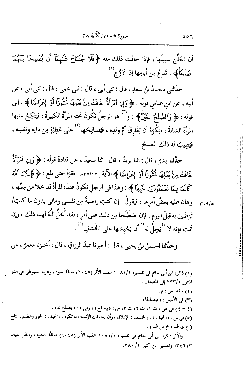 حَدَّثَنِي مُحَمَّدُ بْنُ سَعْدٍ , قَالَ: ثني أَبِي قَالَ: ثني عَمِّي , قَالَ: ثني أَبِي عَنْ أَبِيهِ , عَنِ ابْنِ عَبَّاسٍ قَوْلُهُ: {§وَإِنِ امْرَأَةٌ خَافَتْ مِنْ بَعْلِهَا نُشُوزًا أَوْ إِعْرَاضًا} [النساء: 128] إِلَى قَوْلِهِ: {وَالصُّلْحُ خَيْرٌ} [النساء: 128] هُوَ الرَّجُلُ تَكُونُ تَحْتَهُ الْمَرْأَةُ الْكَبِيرَةُ , فَيَنْكِحُ عَلَيْهَا الْمَرْأَةَ الشَّابَّةَ , فَيُكْرَهُ أَنْ يُفَارِقَ أُمَّ وَلَدِهِ , فَيُصَالِحَهَا عَلَى عَطِيَّةٍ مِنْ مَالِهِ وَنَفْسِهِ , فَيَطِيبُ لَهُ ذَلِكَ الصُّلْحُ "