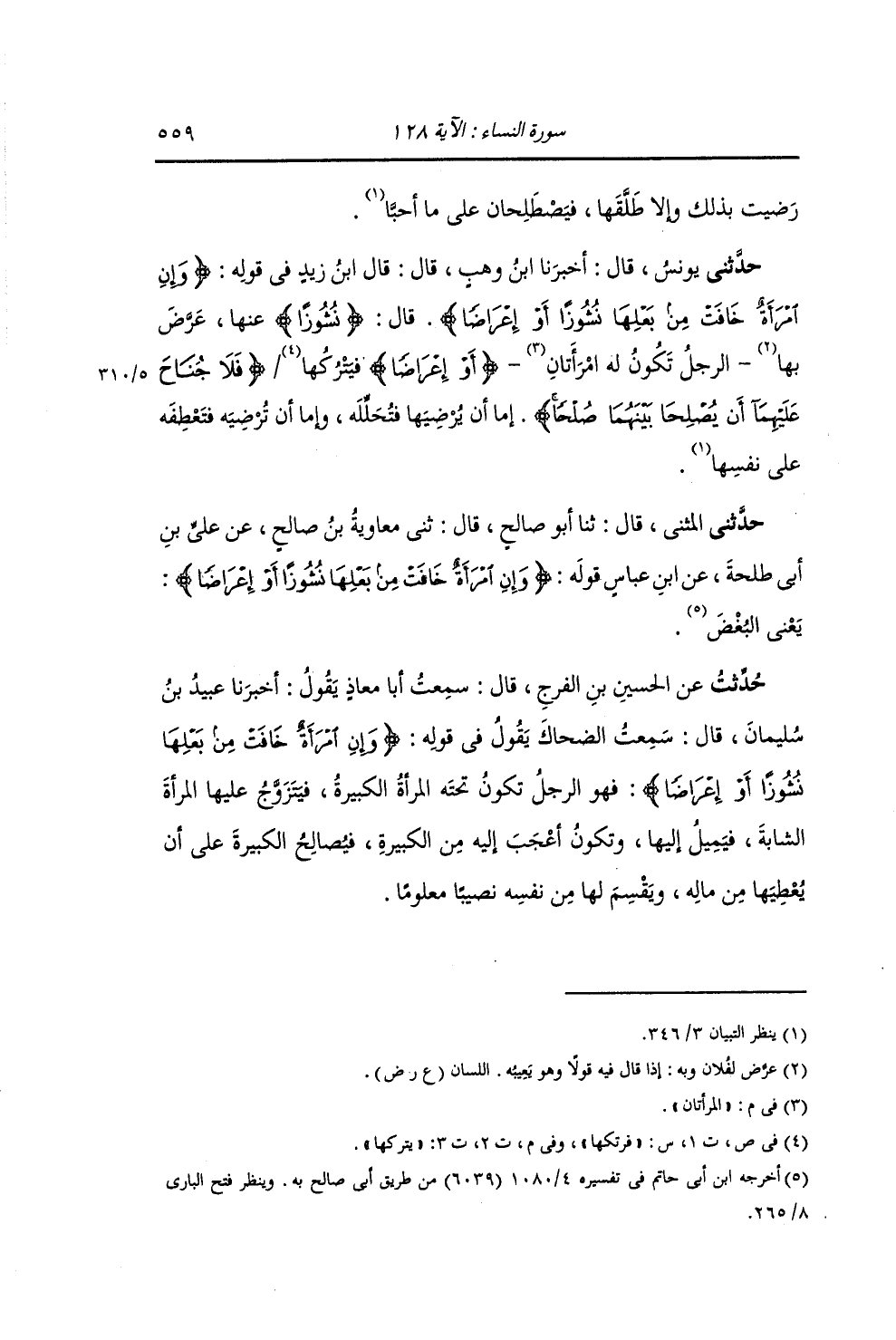 حَدَّثَنِي الْمُثَنَّى , قَالَ: ثنا أَبُو صَالِحٍ , قَالَ: ثني مُعَاوِيَةُ بْنُ صَالِحٍ , عَنْ عَلِيِّ بْنِ أَبِي طَلْحَةَ , عَنِ ابْنِ عَبَّاسٍ , قَوْلُهُ: {§وَإِنِ امْرَأَةٌ خَافَتْ مِنْ بَعْلِهَا نُشُوزًا أَوْ إِعْرَاضًا} [النساء: 128] يَعْنِي: الْبُغْضَ "