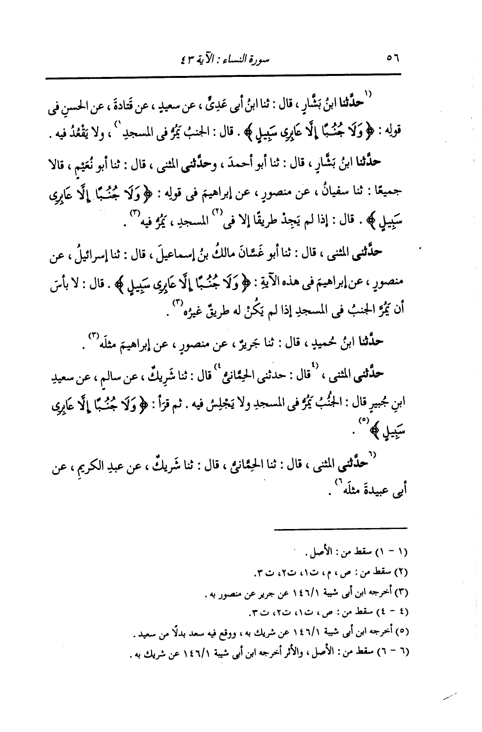 حَدَّثَنَا ابْنُ بَشَّارٍ , قَالَ: ثنا أَبُو أَحْمَدَ , وَحَدَّثَنِي الْمُثَنَّى , قَالَ: ثنا أَبُو نُعَيْمٍ , قَالَا جَمِيعًا: ثنا سُفْيَانُ , عَنْ مَنْصُورٍ , عَنْ إِبْرَاهِيمَ , فِي قَوْلِهِ: {§وَلَا جُنُبًا إِلَّا عَابِرِي سَبِيلٍ} [النساء: 43] قَالَ: «إِذَا لَمْ يَجِدْ طَرِيقًا إِلَّا الْمَسْجِدَ يَمُرُّ فِيهِ»