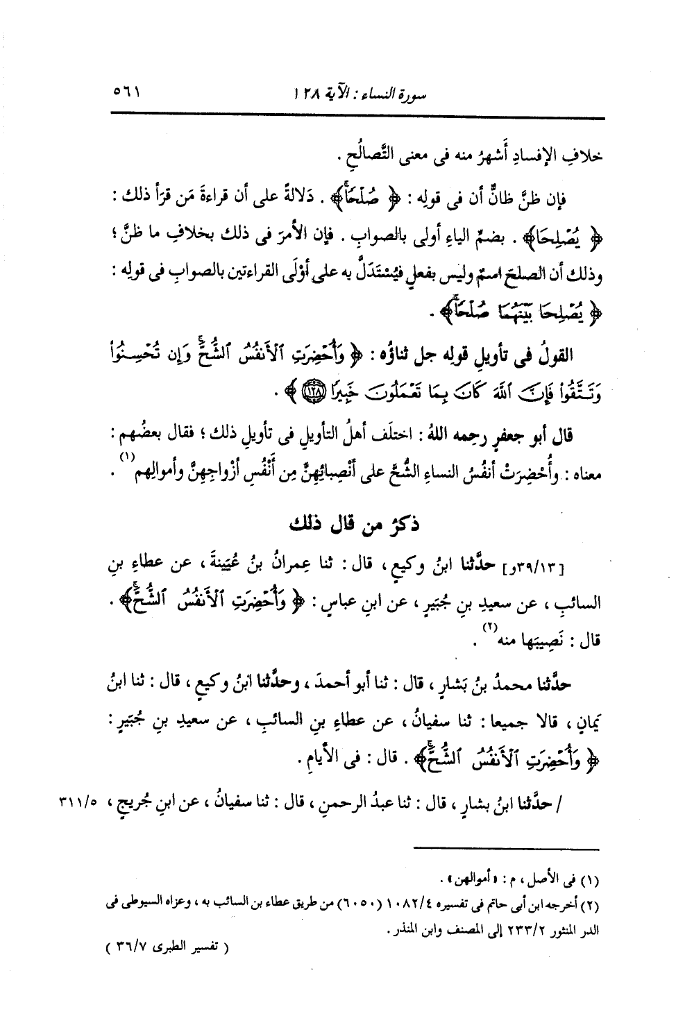 §الْقَوْلُ فِي تَأْوِيلِ قَوْلِهِ تَعَالَى: {وَأُحْضِرَتِ الْأَنْفُسُ الشُّحَّ وَإِنْ تُحْسِنُوا وَتَتَّقُوا فَإِنَّ اللَّهَ كَانَ بِمَا تَعْمَلُونَ خَبِيرًا} [النساء: 128] اخْتَلَفَ أَهْلُ التَّأْوِيلِ فِي تَأْوِيلِ ذَلِكَ , فَقَالَ بَعْضُهُمْ: مَعْنَاهُ: وَأُحْضِرَتْ أَنْفُسُ النِّسَاءِ الشُّحَّ عَلَى أَنْصِبَائِهِنَّ مِنْ أَنْفَسِ أَزْوَاجِهِنَّ وَأَمْوَالِهِنَّ