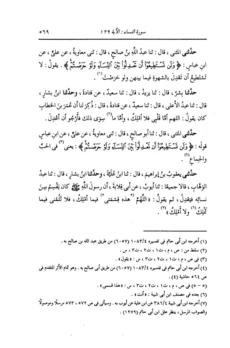 حَدَّثَنِي الْمُثَنَّى , قَالَ: ثنا أَبُو صَالِحٍ , قَالَ: ثني مُعَاوِيَةُ , عَنْ عَلِيٍّ , عَنِ ابْنِ عَبَّاسٍ , قَوْلُهُ: {§وَلَنْ تَسْتَطِيعُوا أَنْ تَعْدِلُوا بَيْنَ النِّسَاءِ وَلَوْ حَرَصْتُمْ} [النساء: 129] يَعْنِي: فِي الْحُبِّ وَالْجِمَاعِ "
