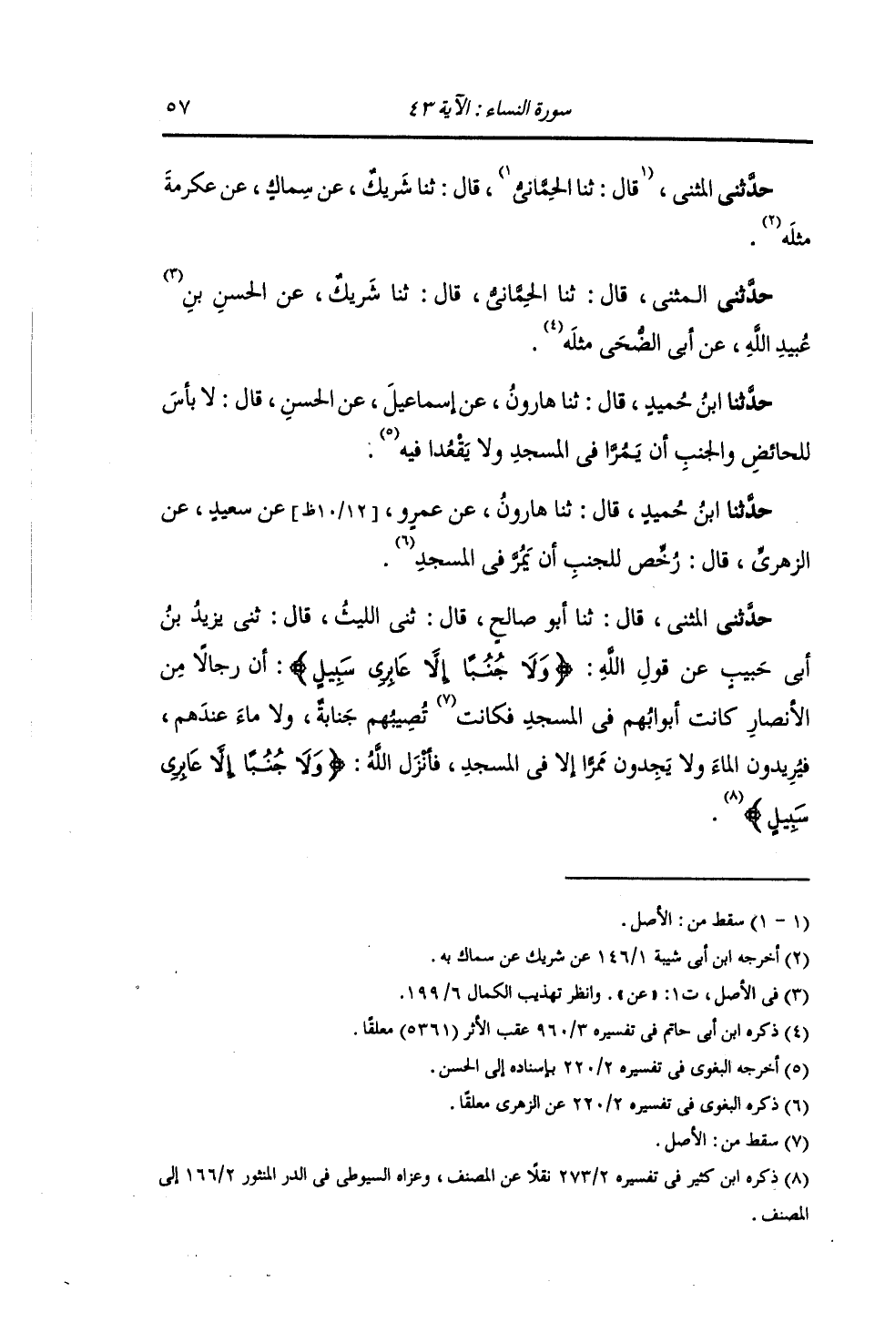 حَدَّثَنِي الْمُثَنَّى , قَالَ: ثنا شَرِيكٌ , عَنْ سَالِمٍ , عَنْ سَعِيدِ بْنِ جُبَيْرٍ , قَالَ: " الْجُنُبُ يَمُرُّ فِي الْمَسْجِدِ وَلَا يَجْلِسُ فِيهِ , ثُمَّ قَرَأَ: {§وَلَا جُنُبًا إِلَّا عَابِرِي سَبِيلٍ} [النساء: 43] حَدَّثَنِي الْمُثَنَّى , قَالَ: ثنا الْحِمَّانِيُّ , قَالَ: ثنا شَرِيكٌ , عَنْ عَبْدِ الْكَرِيمِ , عَنْ أَبِي عُبَيْدَةَ , مِثْلَهُ حَدَّثَنِي الْمُثَنَّى , قَالَ: ثنا الْحِمَّانِيُّ , قَالَ: ثنا شَرِيكٌ , عَنْ سِمَاكٍ , عَنْ عِكْرِمَةَ , مِثْلَهُ حَدَّثَنِي الْمُثَنَّى , قَالَ: ثنا الْحِمَّانِيُّ , قَالَ: ثنا شَرِيكٌ , عَنِ الْحَسَنِ بْنِ عُبَيْدِ اللَّهِ , عَنْ أَبِي الضُّحَى , مِثْلَهُ