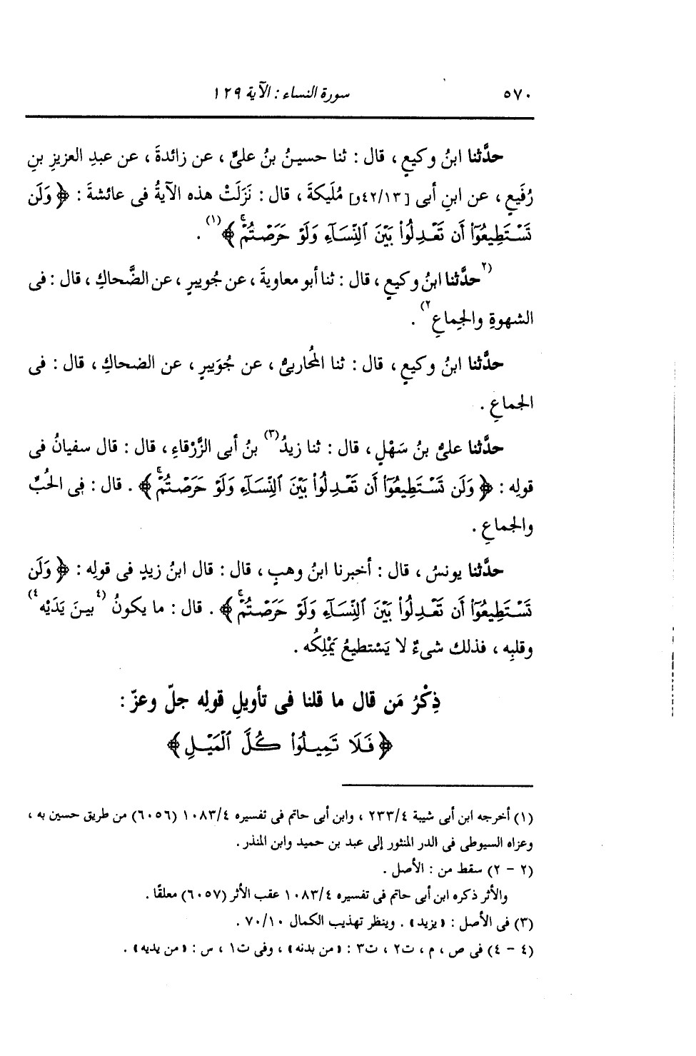 حَدَّثَنَا عَلِيُّ بْنُ سَهْلٍ , قَالَ: ثنا زَيْدُ بْنُ أَبِي الزَّرْقَاءِ , قَالَ: قَالَ سُفْيَانُ فِي قَوْلِهِ: {§وَلَنْ تَسْتَطِيعُوا أَنْ تَعْدِلُوا بَيْنَ النِّسَاءِ وَلَوْ حَرَصْتُمْ} [النساء: 129] قَالَ: «فِي الْحُبِّ وَالْجِمَاعِ»
